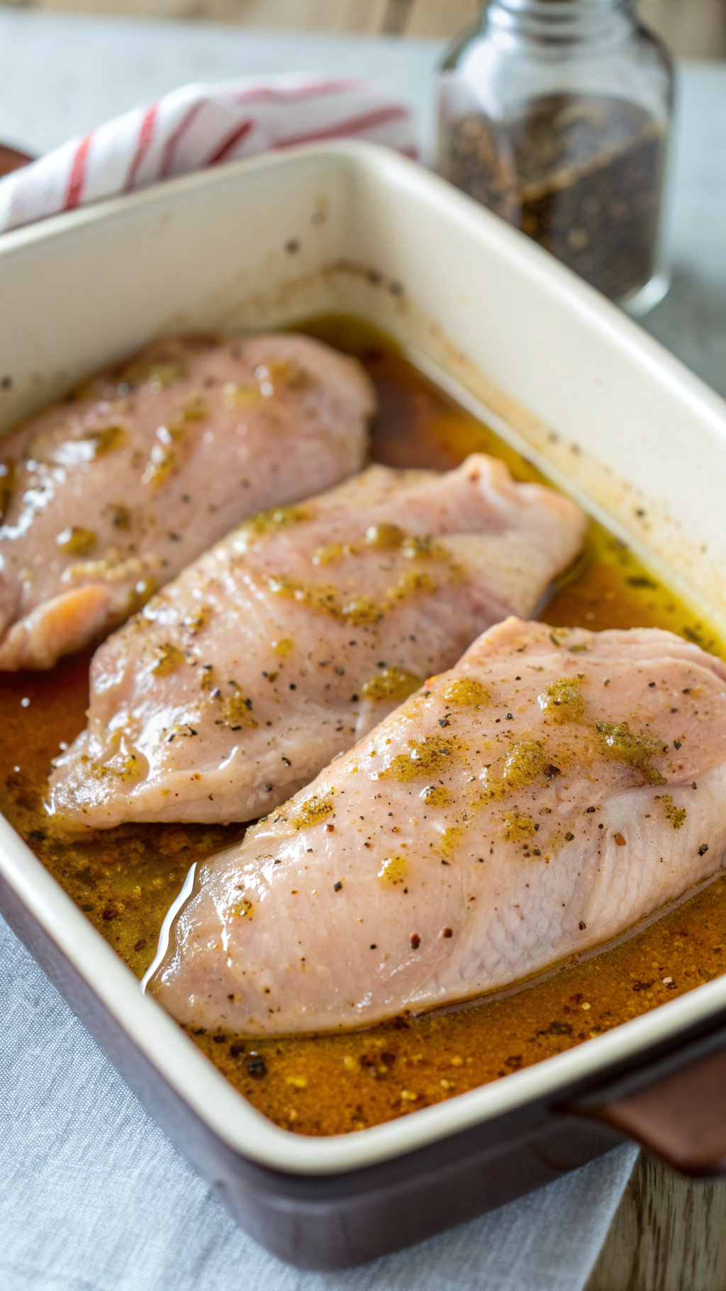 - Place the chicken breasts in a shallow dish or zip-top bag and pour the marinade over them. Turn to coat evenly and marinate for at least 20–30 minutes (or up to 4 hours in the refrigerator).