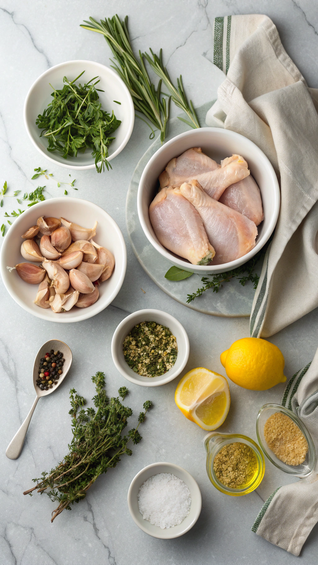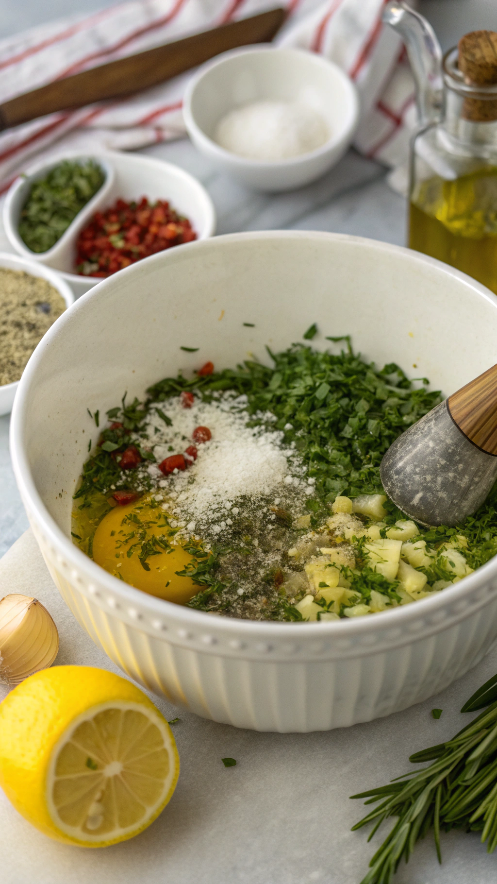 - In a small bowl, combine olive oil, minced garlic, rosemary, thyme, parsley, dried oregano, lemon zest, lemon juice, salt, and black pepper. Stir to form a thick marinade.