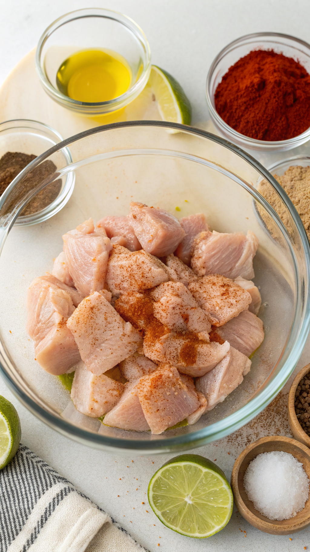 Pat the chicken dry with paper towels so it browns well. Add the chicken to a bowl and drizzle with olive oil and lime juice. Sprinkle in chili powder, smoked paprika, cumin, garlic powder, onion powder, salt, and pepper, then toss until every piece looks coated.