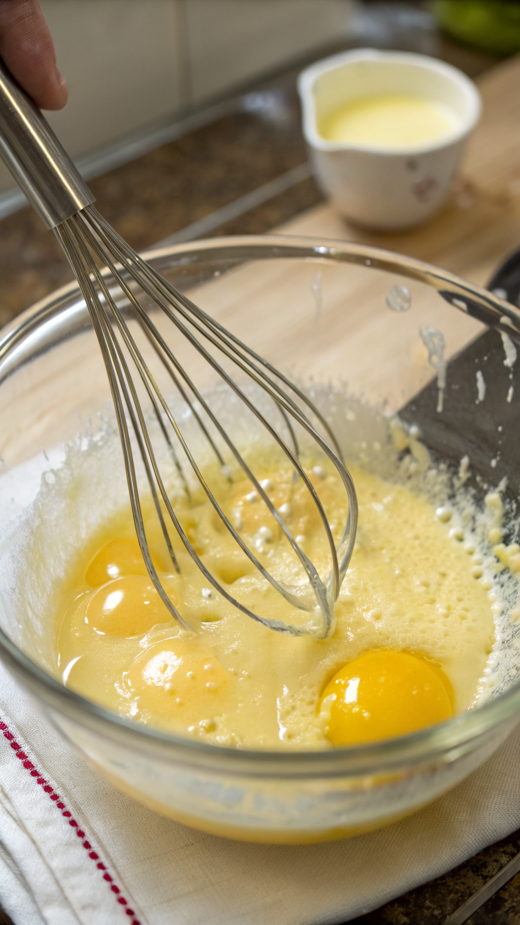 - While whisking continuously, slowly drizzle in the warm melted butter, a little at a time, allowing each addition to fully incorporate before adding more.