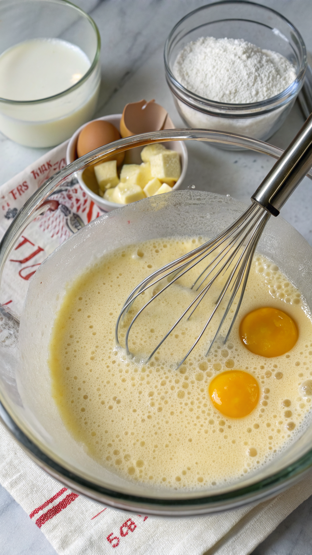 Pour milk into the bowl, then add the egg, melted butter, and vanilla. Whisk from the center outward until the batter comes together. Stop when you see no dry pockets of flour, but keep a few small lumps.