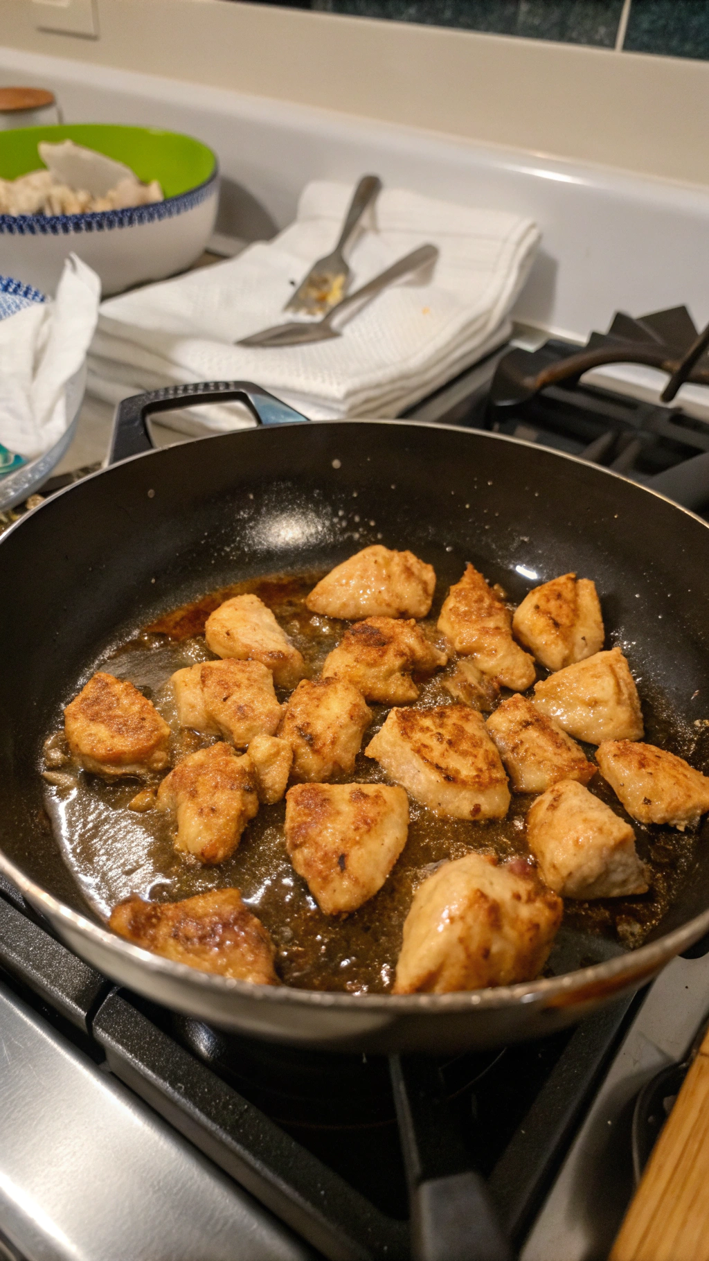 - Do not crowd the skillet; cook chicken in batches so the pieces crisp instead of steaming.