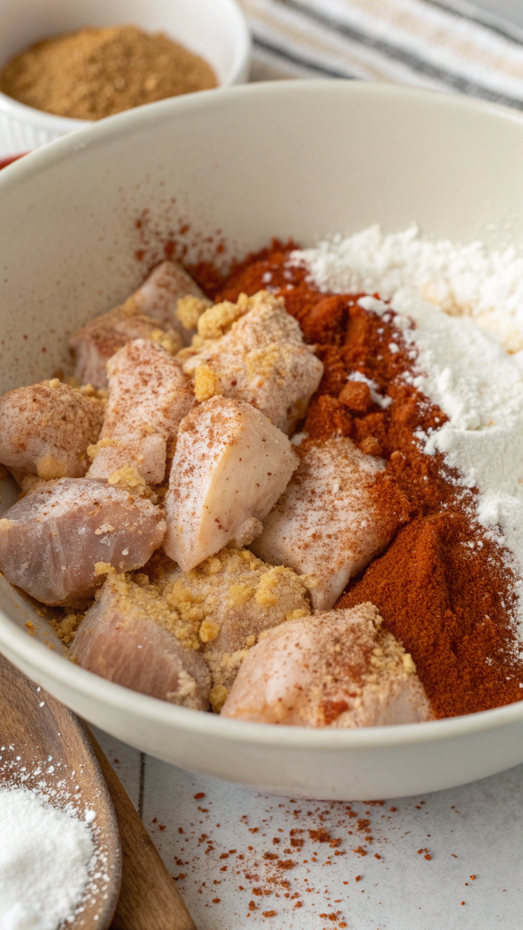 Cut the chicken into small, even bites about 1 inch wide. Add the chicken to a bowl and sprinkle in cornstarch, flour, salt, pepper, and paprika. Toss until every piece looks lightly coated and no dry pockets of starch remain. Set the bowl aside while you mix the sauce.