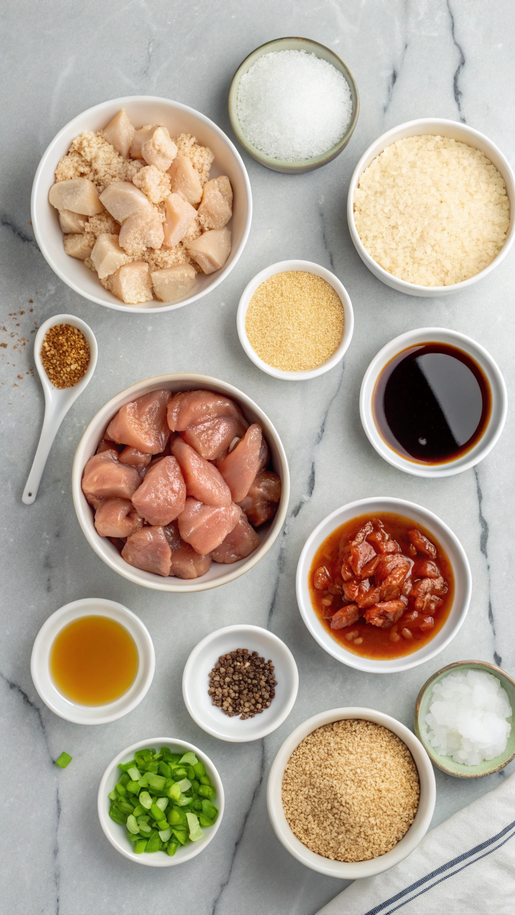 - In a bowl, combine chicken pieces with salt, black pepper, soy sauce, rice vinegar, and egg white. Mix well to coat and let marinate for 10–15 minutes while you prepare the sauce.