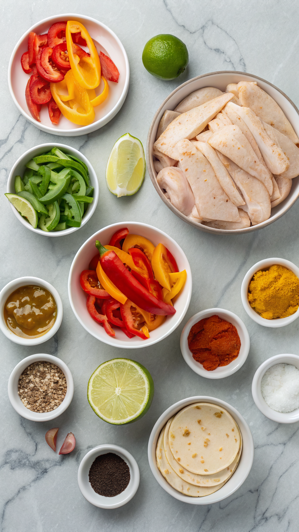 - Return the cooked peppers and onions to the skillet, toss with the chicken, and heat through for 1–2 minutes. Adjust seasoning with additional salt or lime juice if needed.