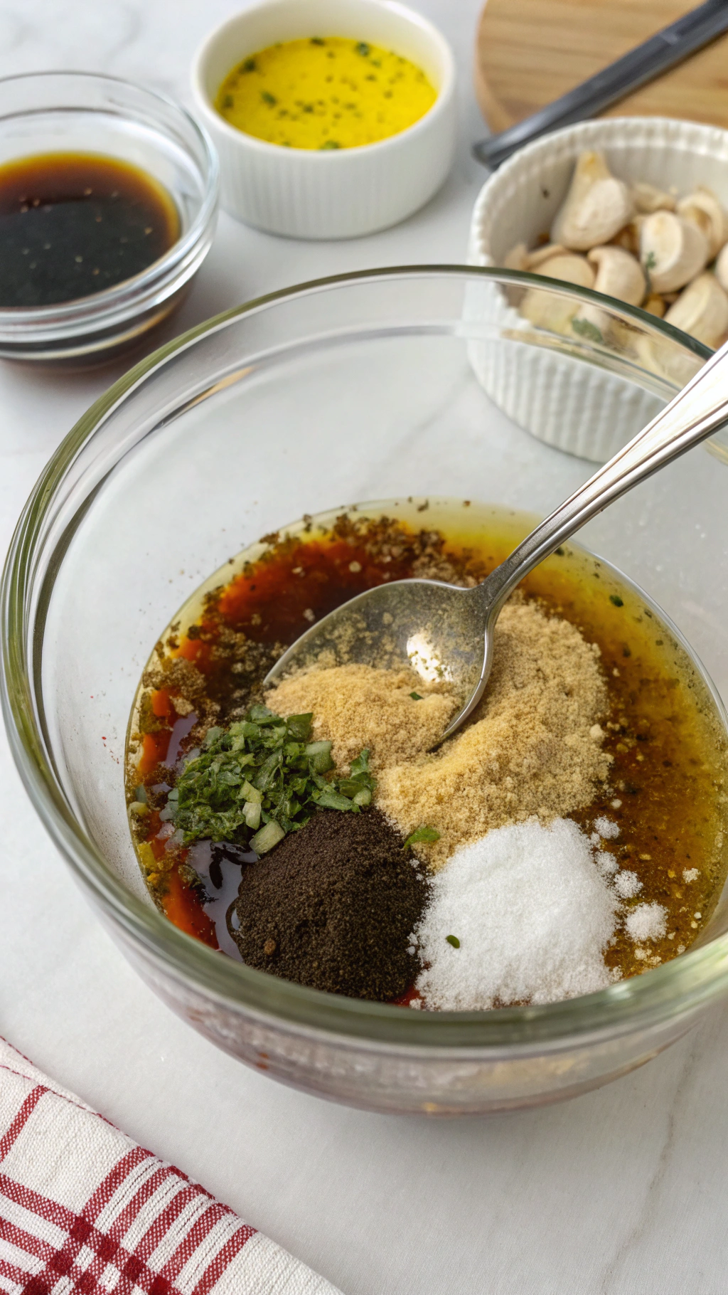 - In a separate bowl, whisk together olive oil, soy sauce, lemon juice, minced garlic, smoked paprika, dried oregano, black pepper, and salt if using.