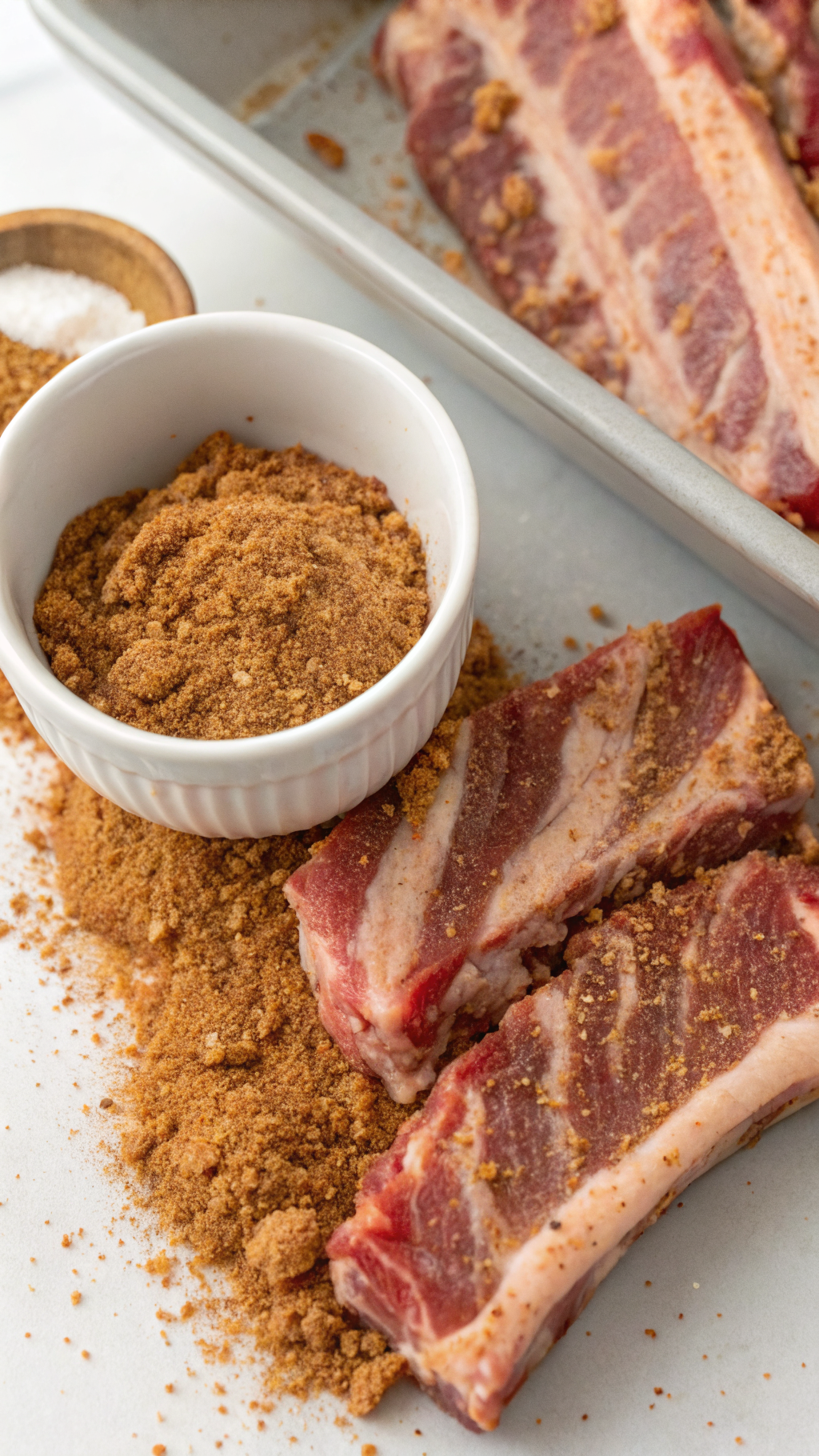 - Pat the ribs dry and rub the spice mixture evenly over both sides of the rack.