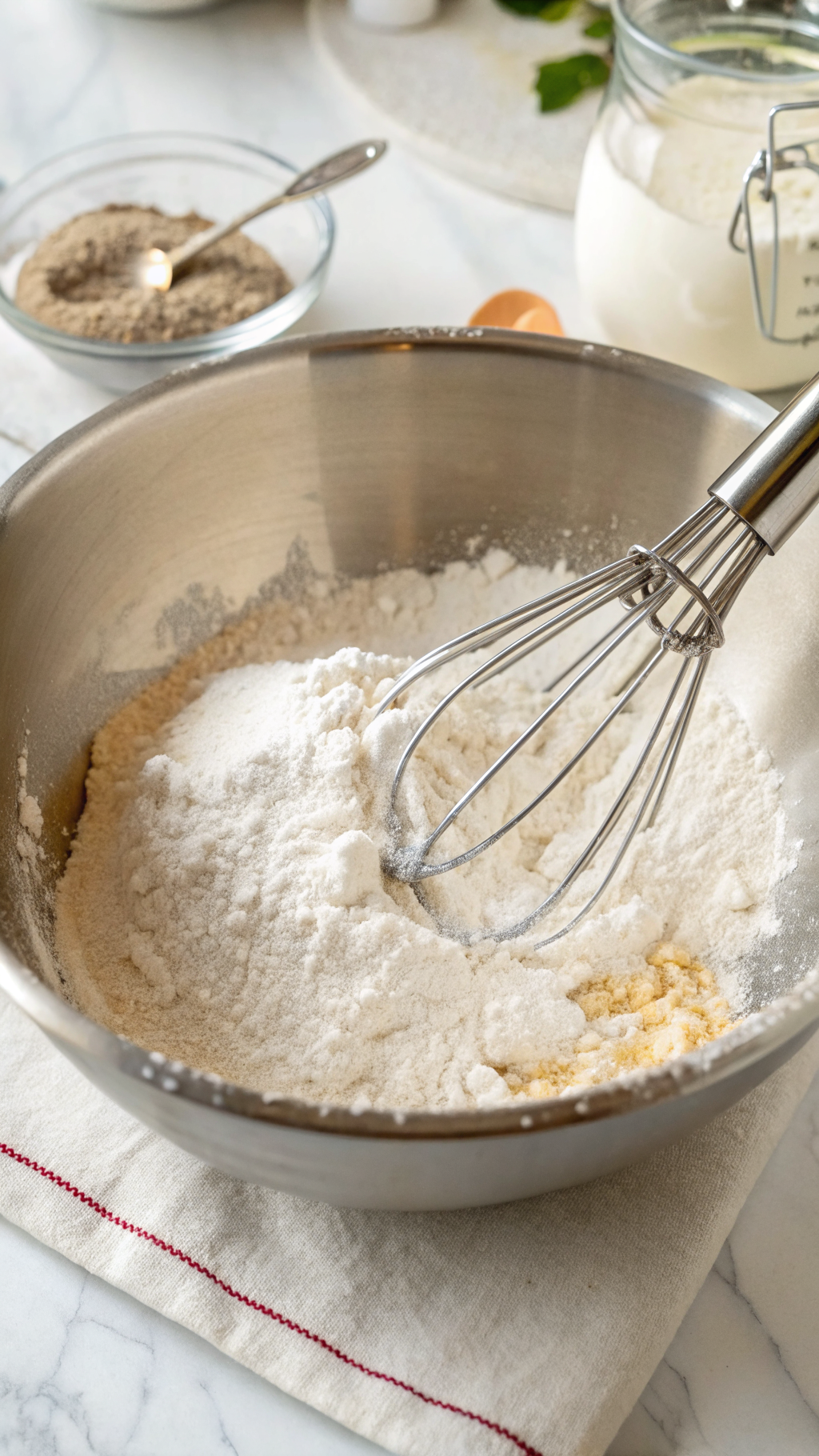 Preheat your oven to 425°F and line a baking sheet with parchment paper. Add flour, salt, baking soda, and sugar to a large bowl. Whisk everything together so the baking soda spreads evenly and you avoid weird pockets of bitterness.