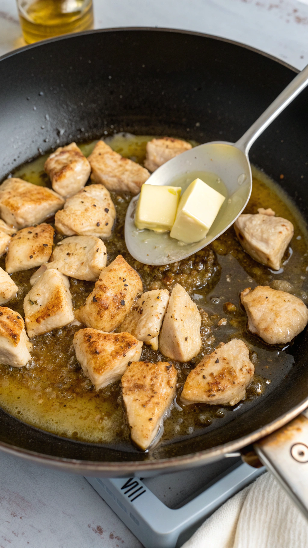 - Do not crowd the pan; cook chicken in batches so the pieces brown instead of steaming.