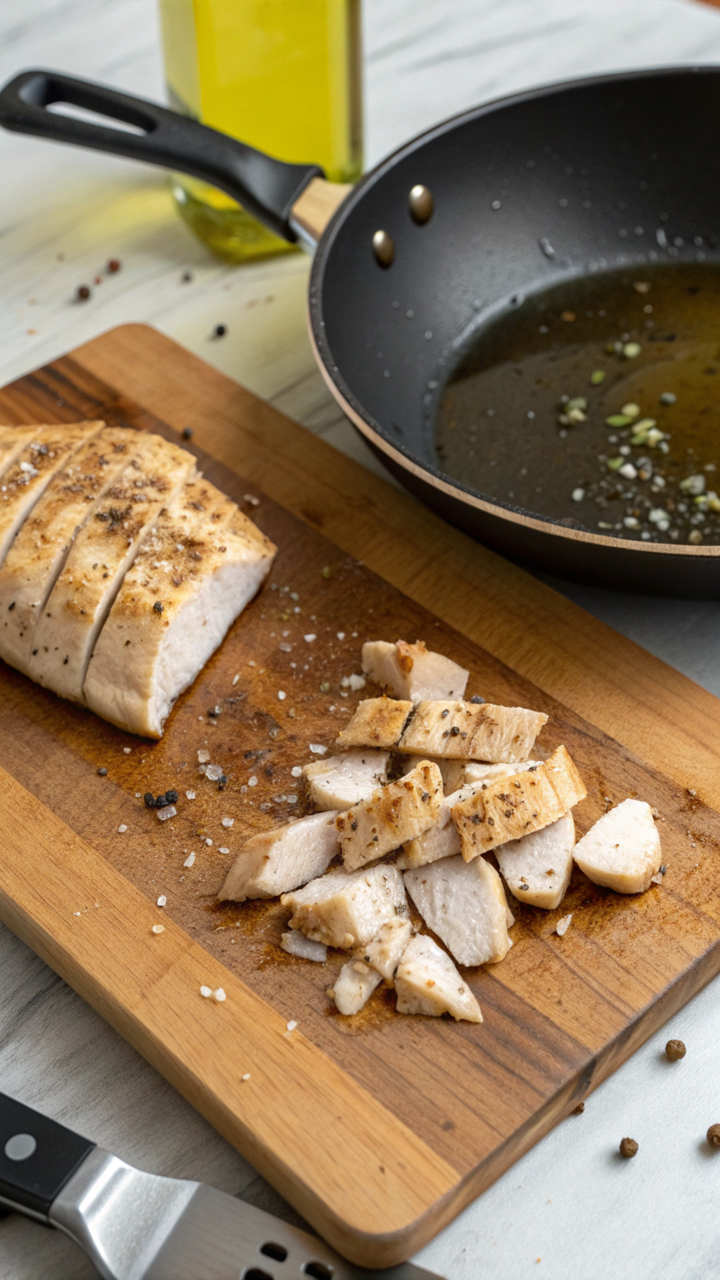 - Prepare the chicken if not already cooked: season with salt and pepper, grill or pan-sear until fully cooked, then let cool slightly and dice or slice.