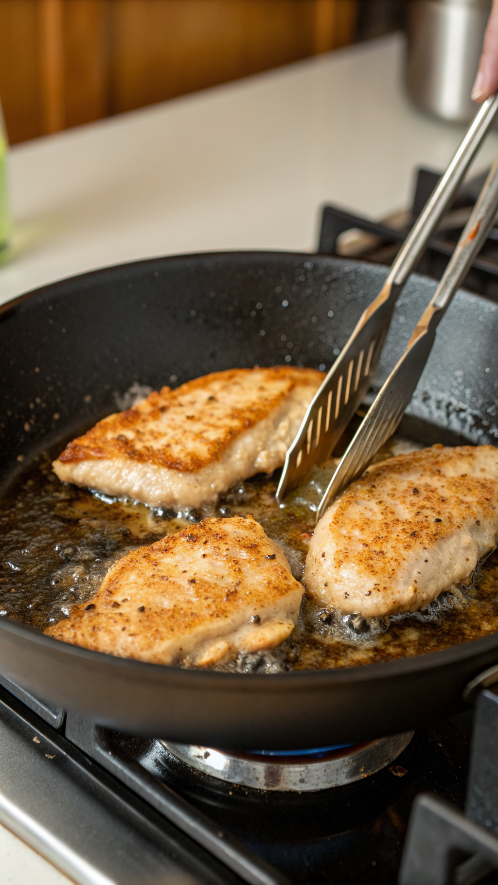 In the same skillet, lower the heat to medium and add the minced garlic. Stir for about 30 seconds until it smells fragrant but not burned. Pour in the chicken broth and scrape up the browned bits from the bottom of the pan with a wooden spoon.