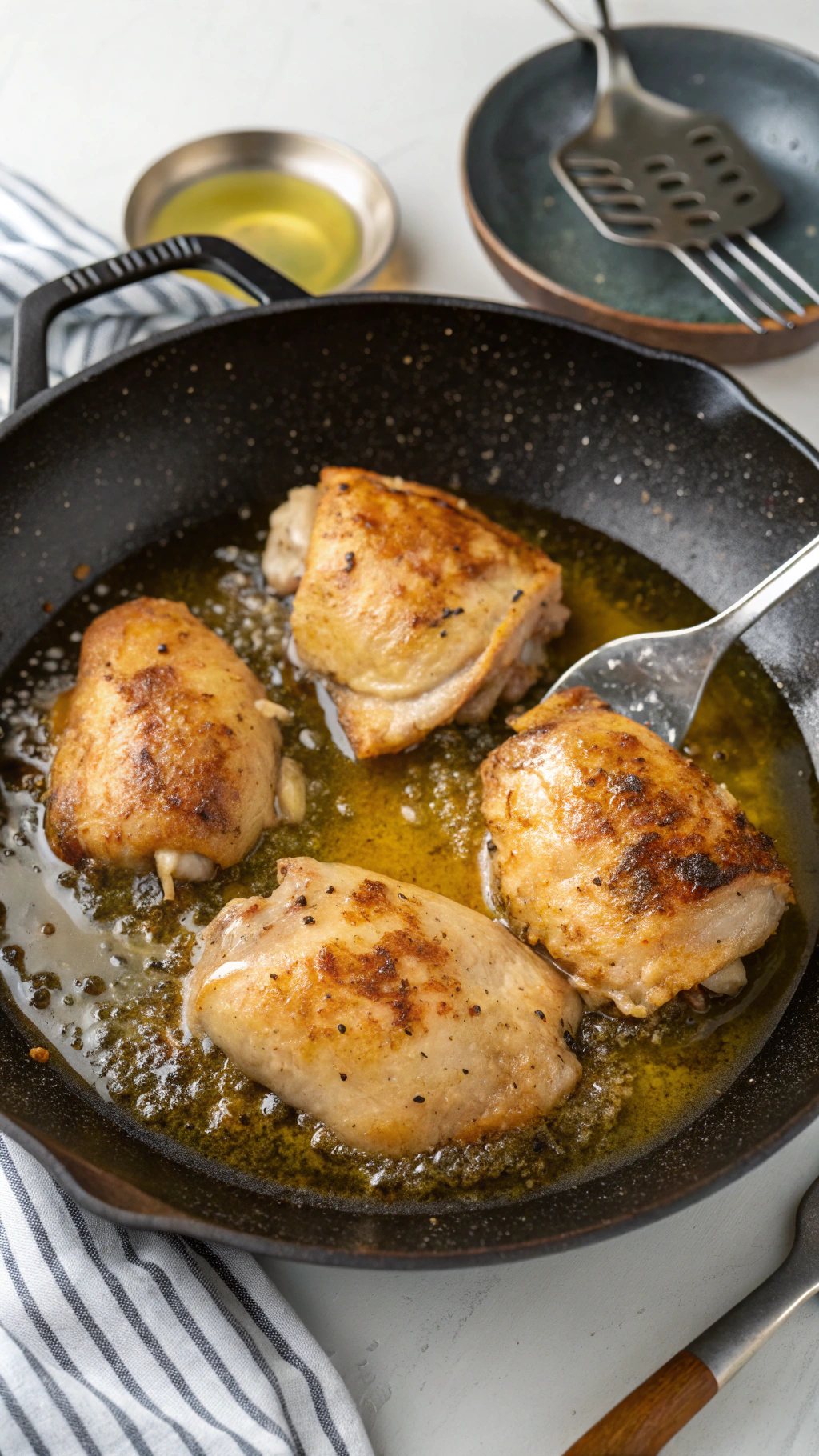 - Heat the olive oil in a large skillet over medium-high heat. Place the chicken thighs skin-side down and cook for 6–8 minutes until the skin is golden and crispy. Flip and cook for another 5–6 minutes. Remove the chicken from the skillet and set aside.