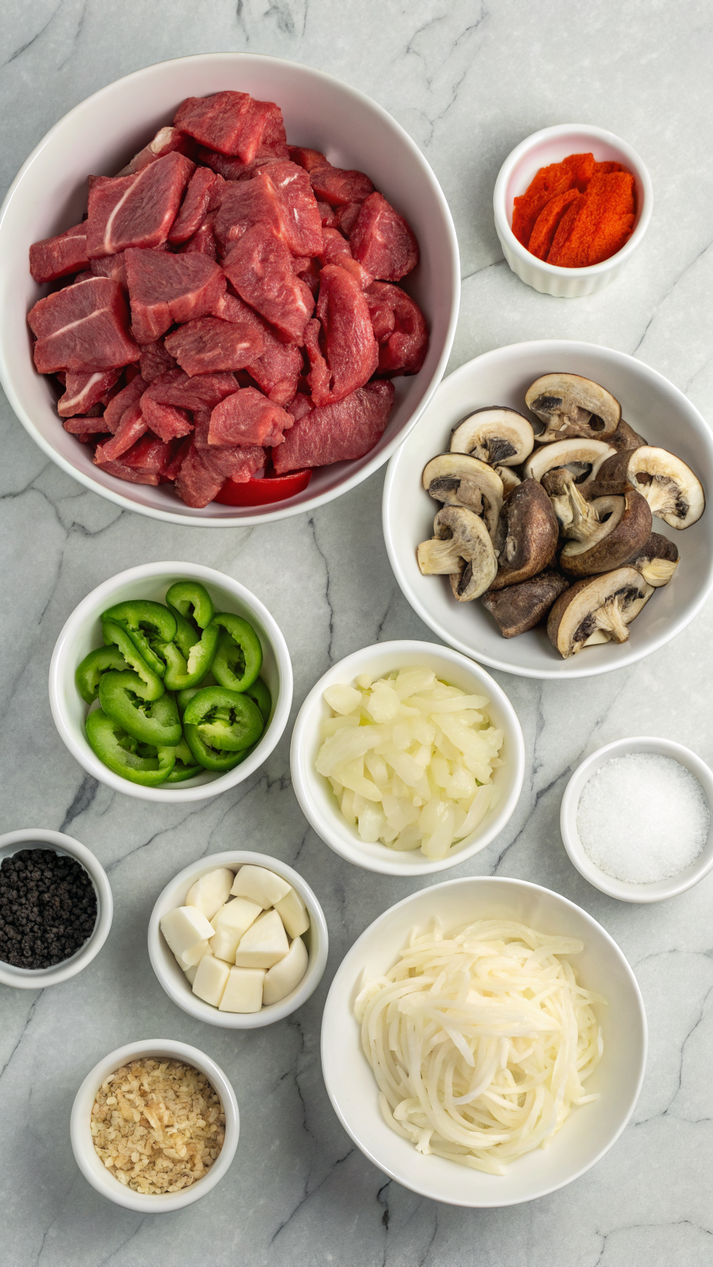 - Add the garlic, salt, black pepper, onion powder, and paprika to the vegetables. Cook for 1–2 minutes until fragrant, then spread the mixture evenly over the beef in the baking dish.