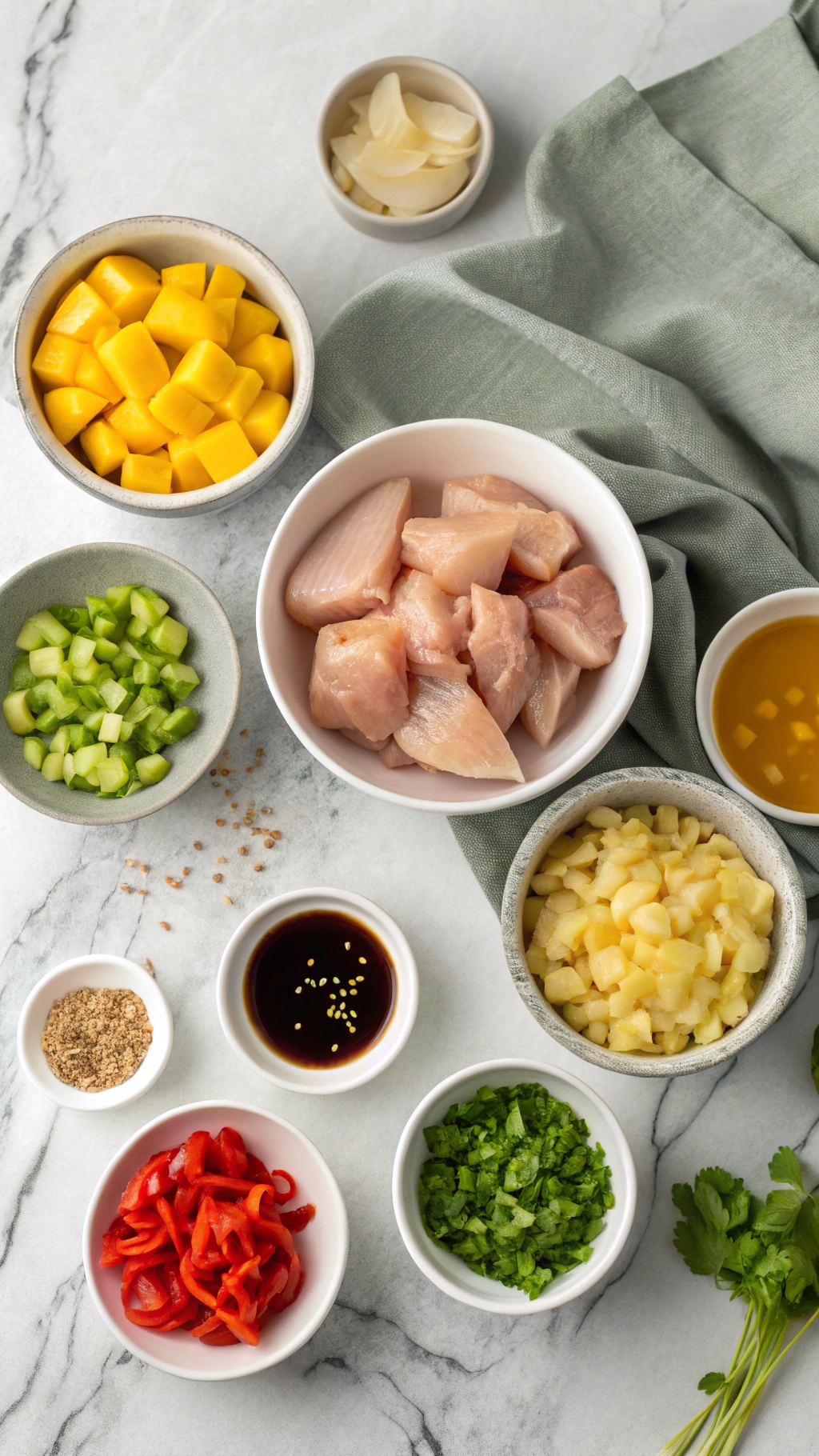 In another bowl, combine diced mango, soy sauce, chicken broth, honey, rice vinegar, lime juice, sriracha, ginger, and garlic. Stir until everything blends and the mango pieces sit in a flavorful bath. Taste a spoonful and adjust sweetness or heat to match your preference.