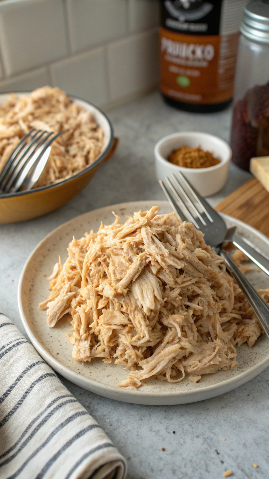 While you shred, keep the sauce on low heat so it continues to thicken slightly. If it thickens too much, add a small splash of broth or water to loosen it.
