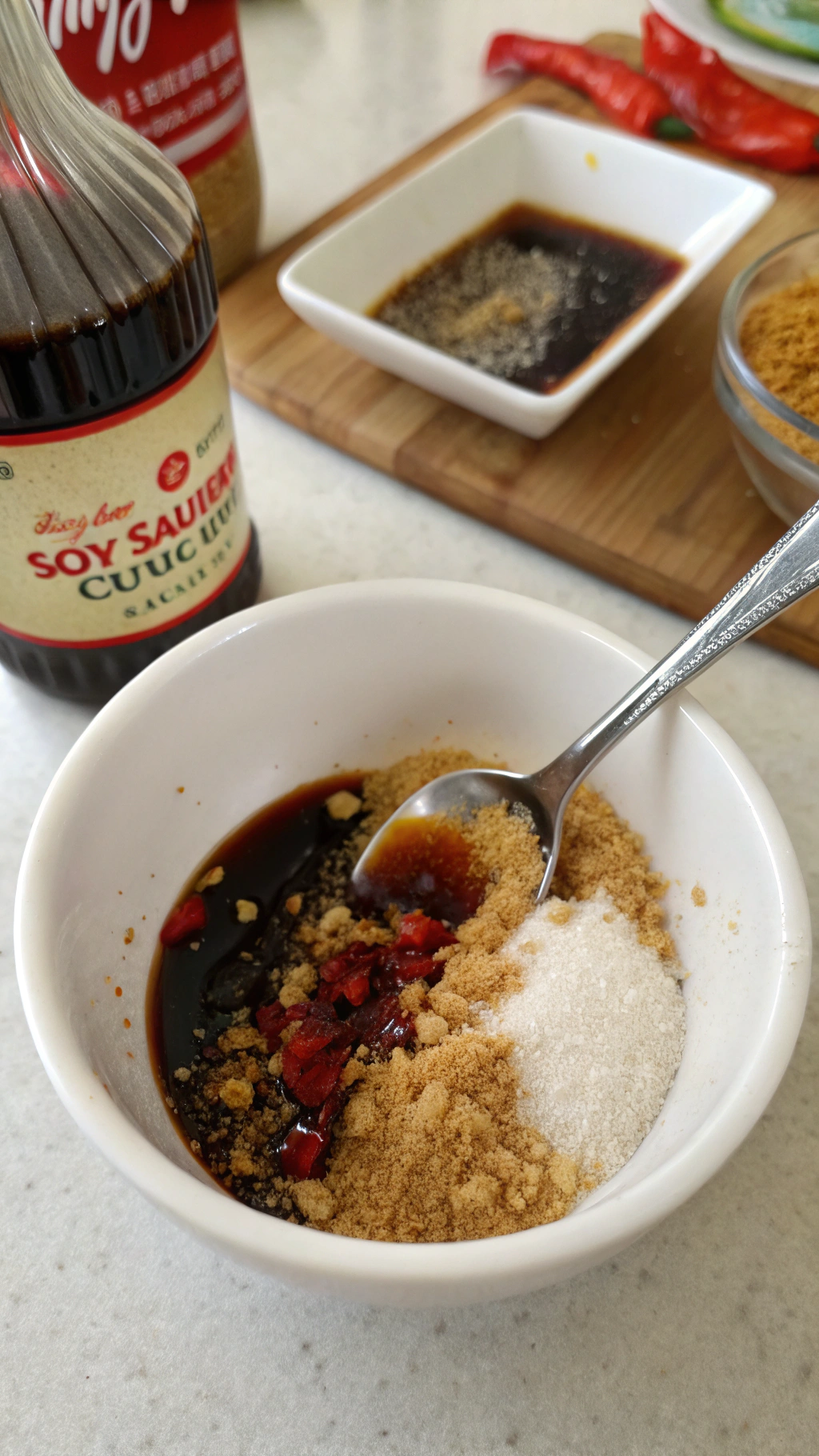 In a small bowl, whisk together soy sauce, water or broth, brown sugar, hoisin sauce, rice vinegar, sesame oil, and crushed red pepper flakes. Whisk until the sugar dissolves and the sauce looks smooth. Taste a tiny bit and adjust with more sugar for sweetness or more vinegar for brightness.