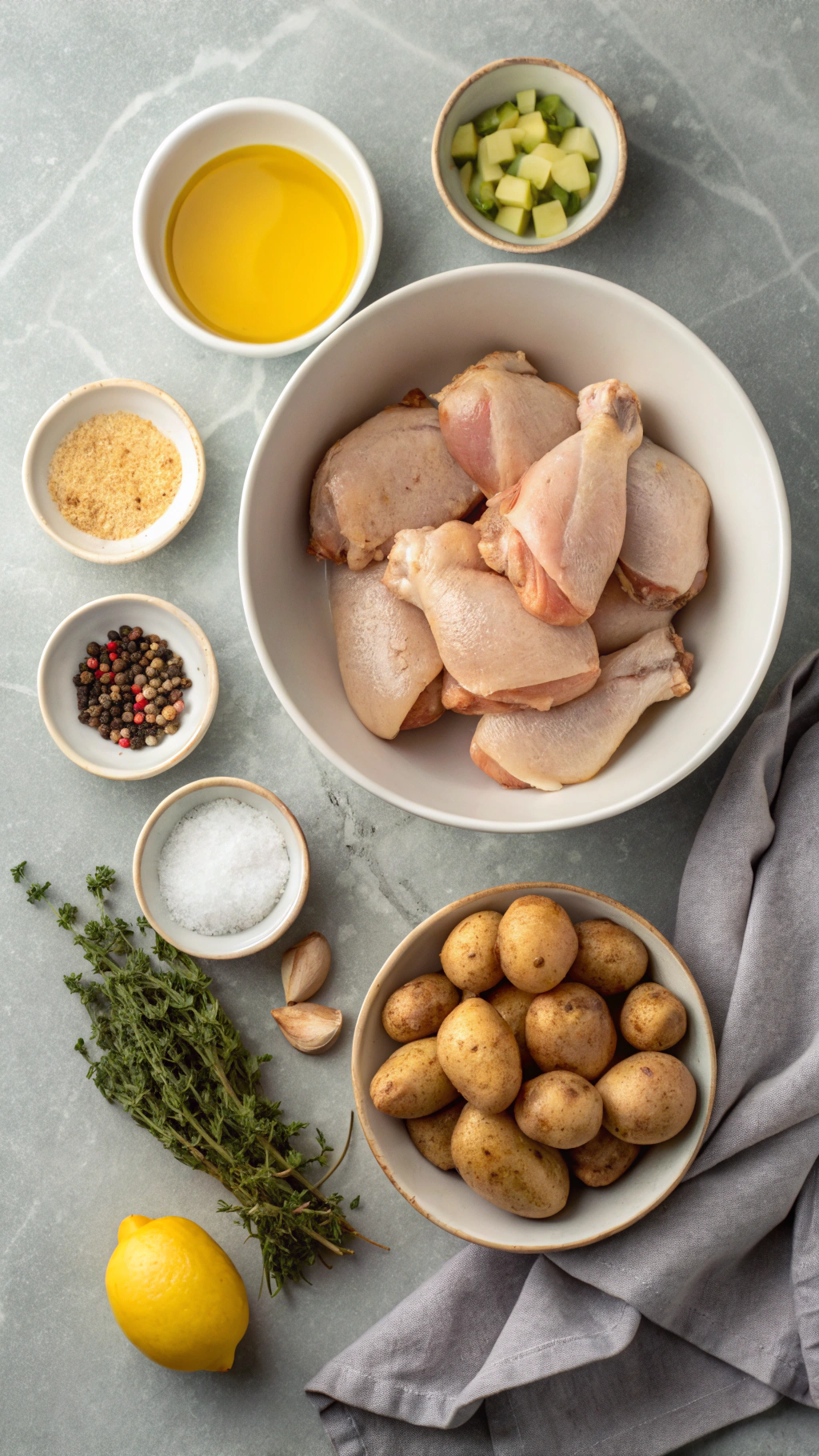 Approximate per serving (1 chicken thigh with potatoes): 520 calories; fat 30 g; saturated fat 8 g; carbohydrates 32 g; fiber 4 g; sugars 2 g; protein 30 g; sodium 650 mg. Values are estimates and will vary based on exact ingredients, brands, and portion sizes.