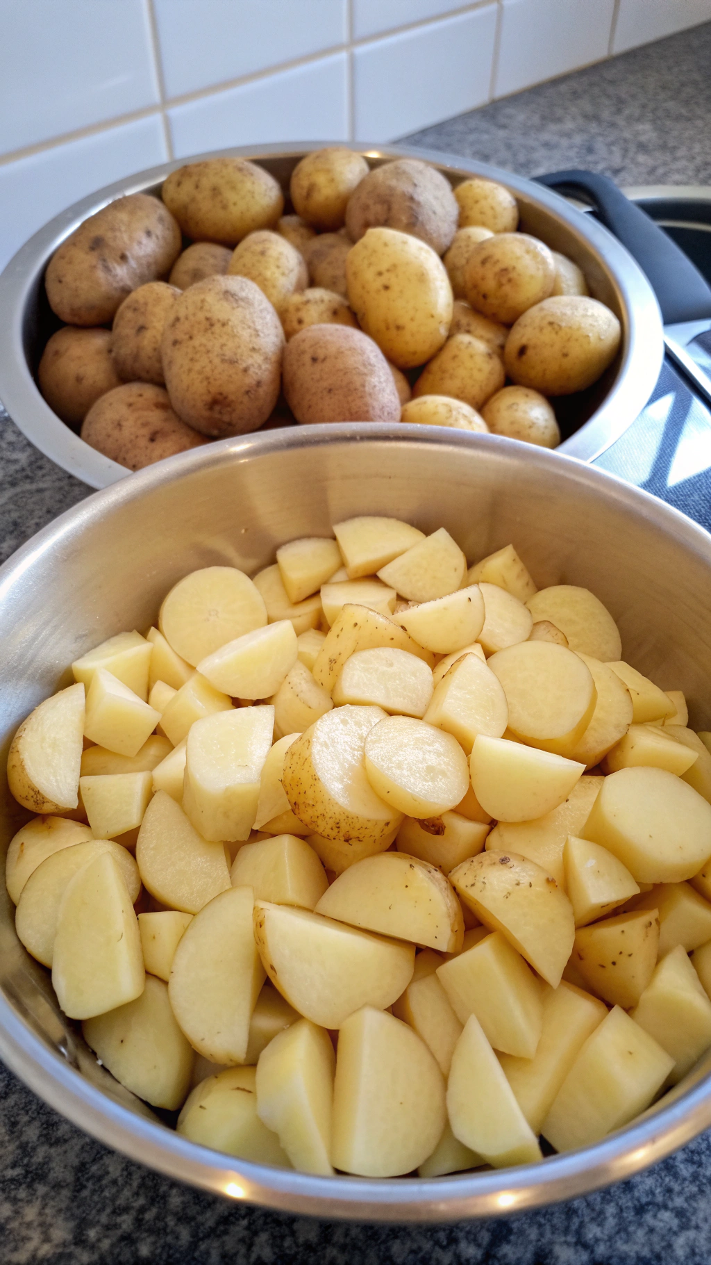 - If you use russet potatoes, cut them into 1-inch chunks and pat them dry.