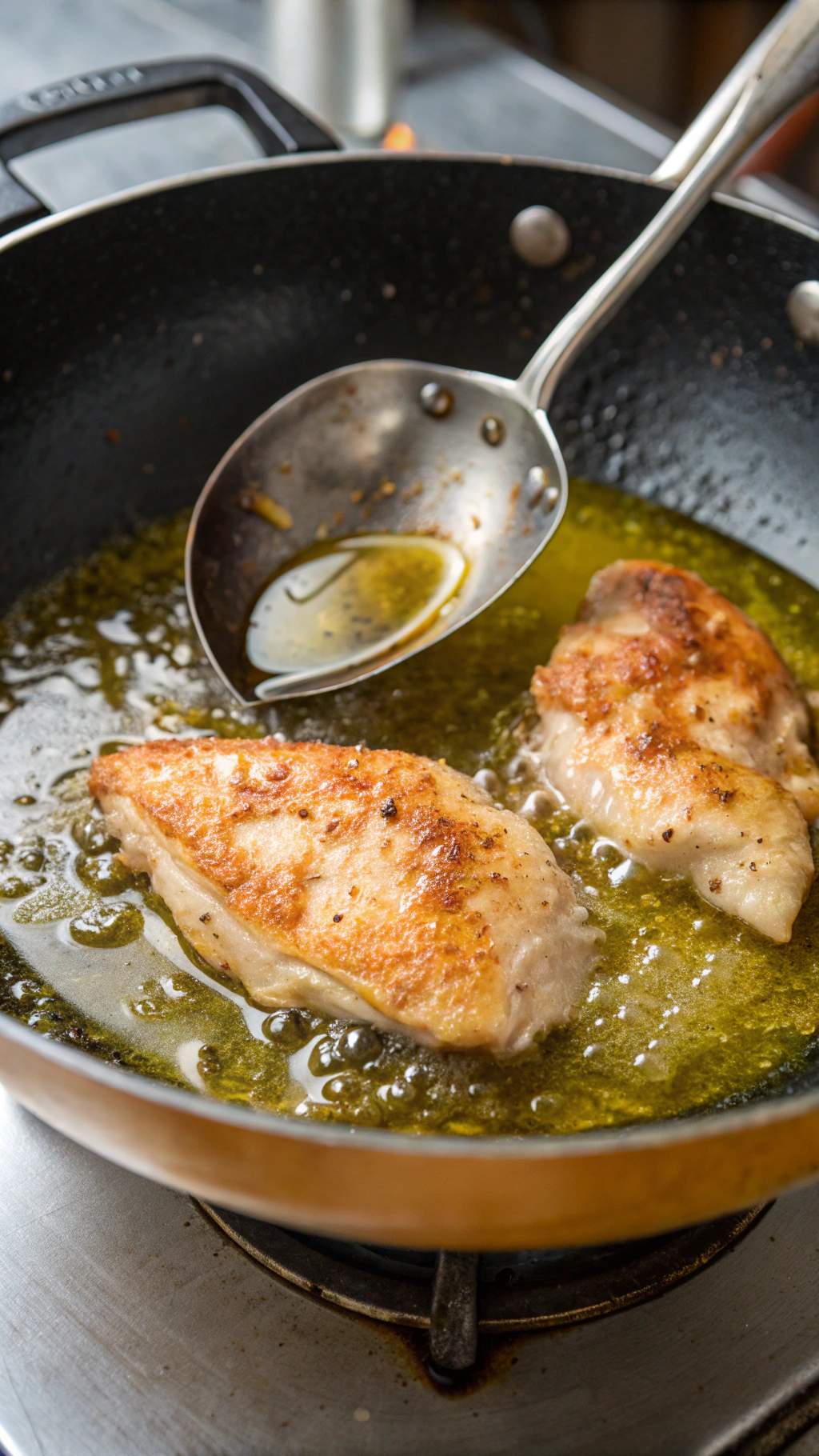 Place the chicken skin side down and cook 5–7 minutes until the skin looks golden and crisp. Flip and cook another 3–4 minutes on the other side, then transfer the chicken to a plate and set it aside.