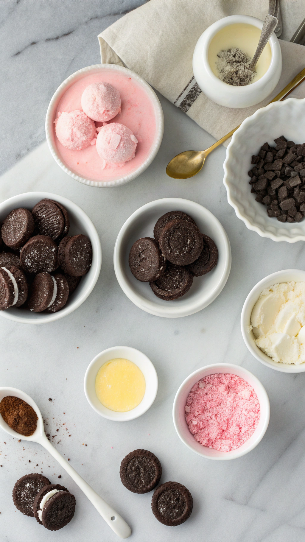 - Optional toppings: pastel sprinkles, extra Oreo crumbs, crushed freeze-dried strawberries, white drizzle