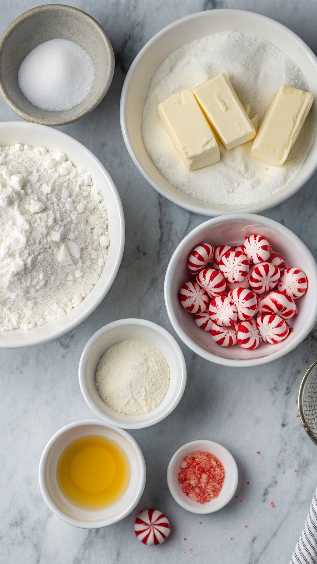Preheat your oven to 350°F (175°C). Line two baking sheets with parchment paper and set them aside. Crush your candy canes in a zip-top bag with a rolling pin until you see fine crumbs with just a few tiny bits.