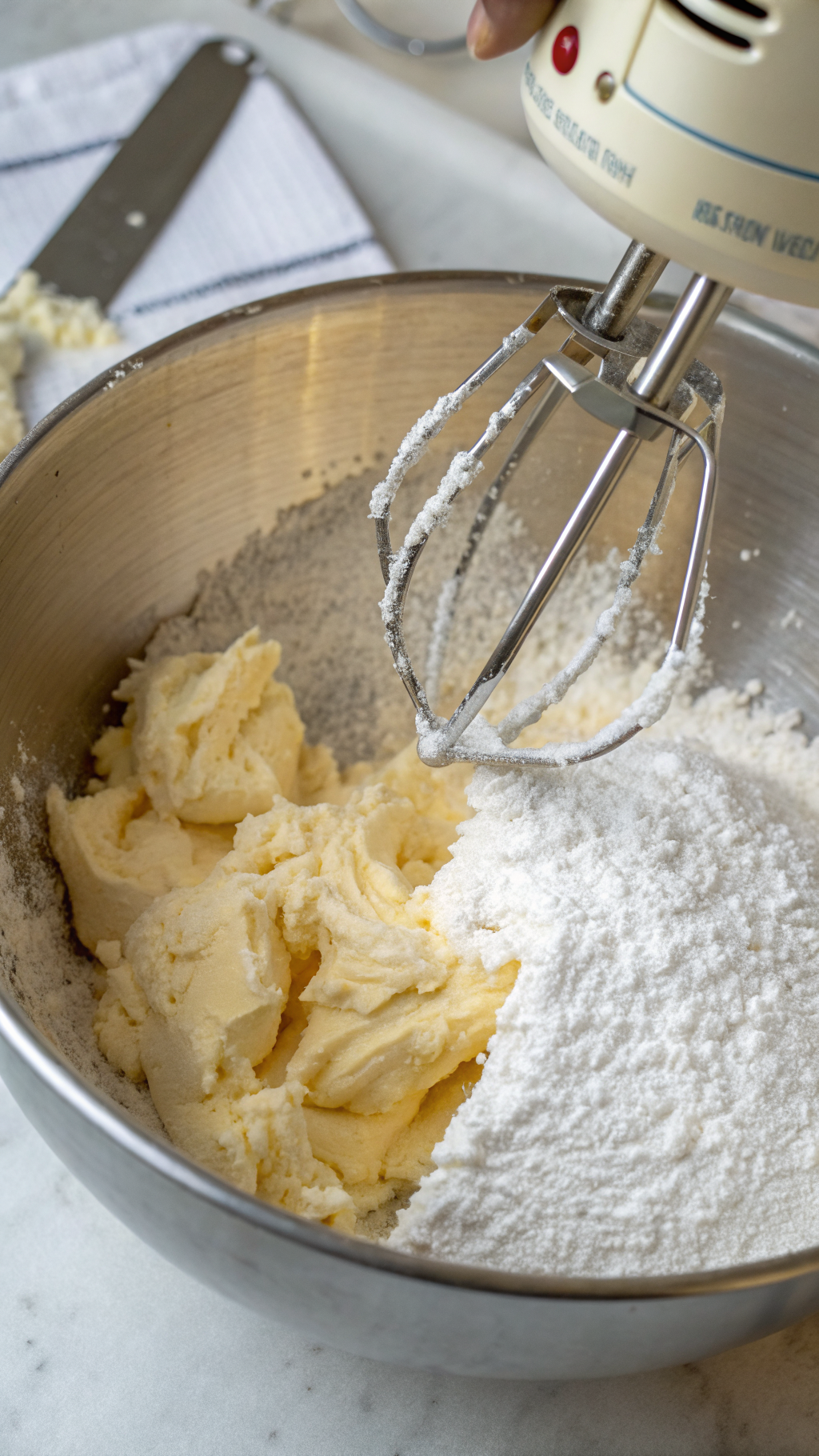Cover the bowl and place it in the fridge for 20–30 minutes. This short chill helps the butter firm up and keeps the cookies round and puffy. Use this time to clean up the counter and set up your rolling station with powdered sugar in a shallow bowl.
