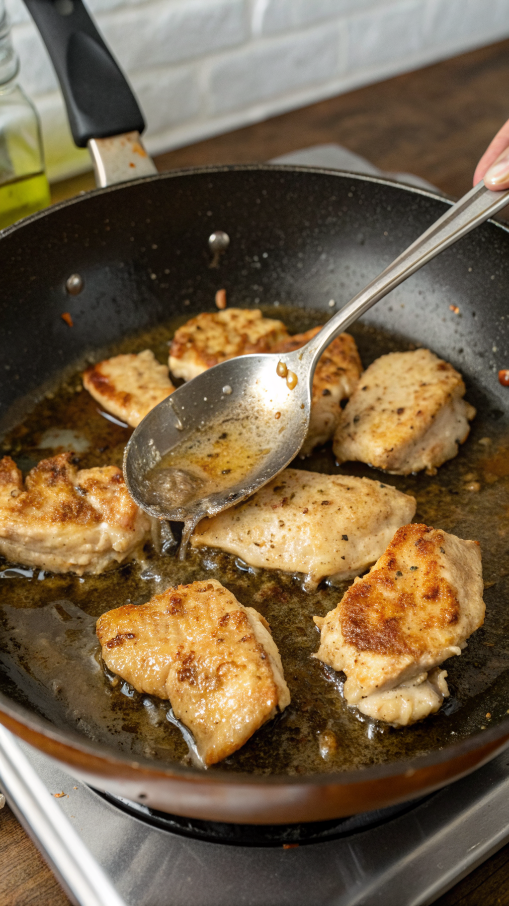 4. Pour in the chicken broth, scraping up any browned bits from the bottom of the pan. Simmer for 2–3 minutes to slightly reduce.