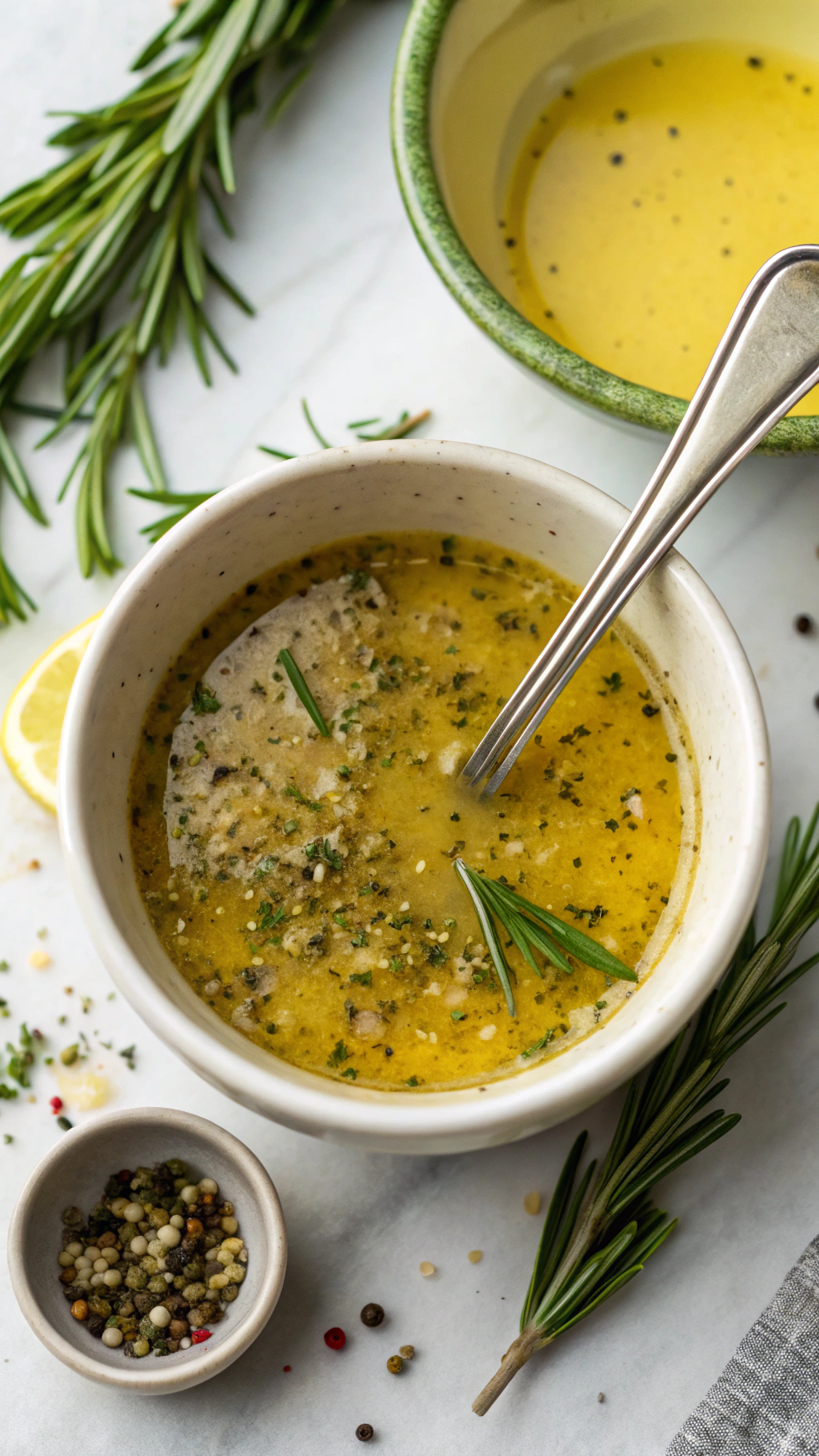 2. In a small bowl, whisk together Dijon mustard, olive oil, lemon juice, minced garlic, chopped rosemary, thyme (if using), salt, pepper, and honey (if using) until well combined.