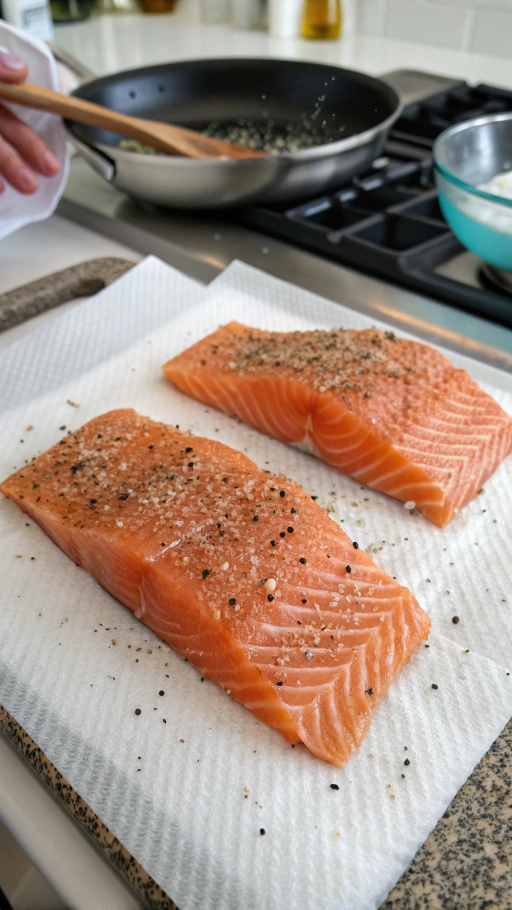 - Pat the salmon fillets dry with paper towels. Season both sides lightly with salt and black pepper.