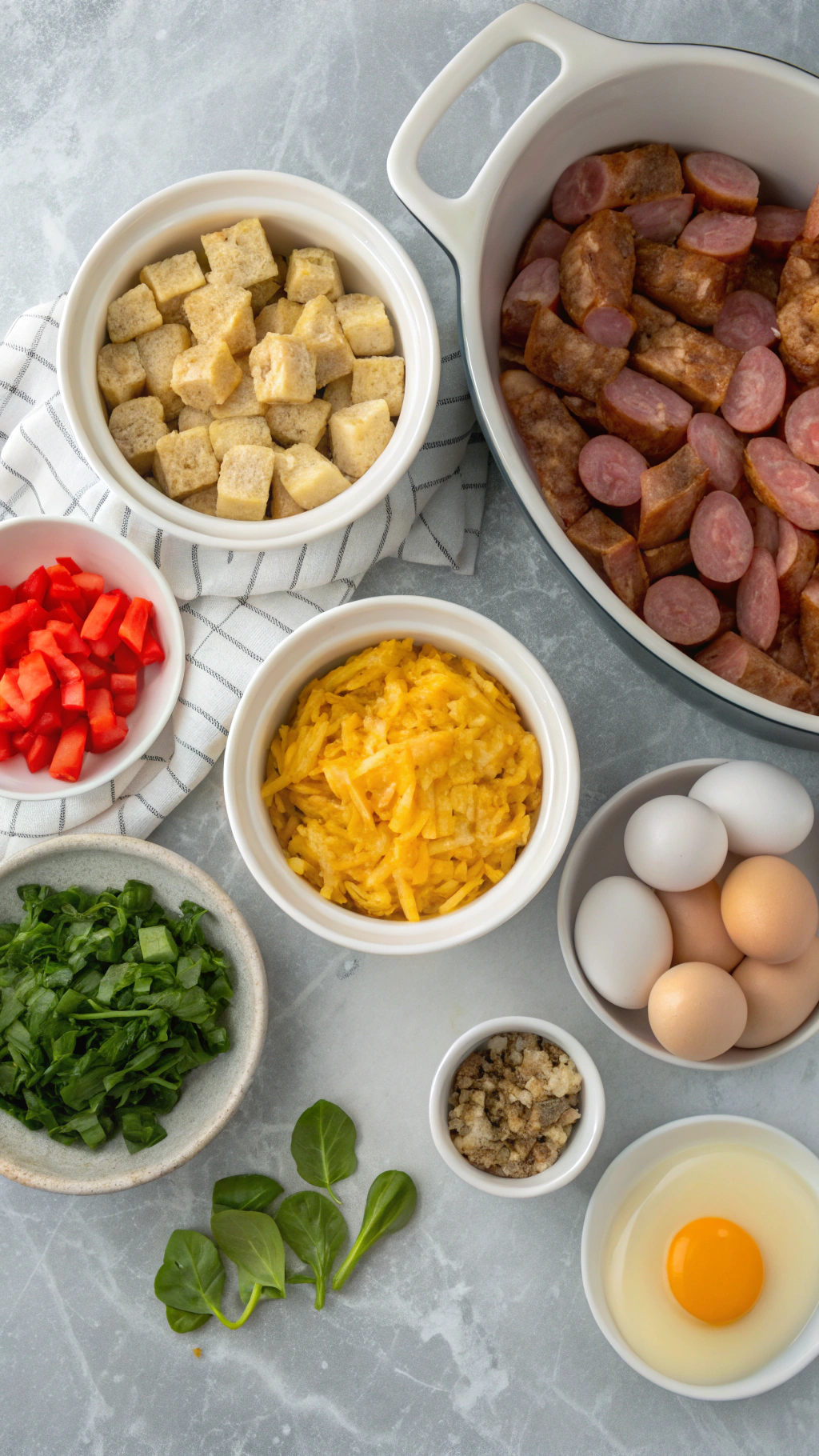 - Spread bread cubes evenly in the prepared baking dish. Top with sliced sausages, sautéed vegetables, and shredded cheese.