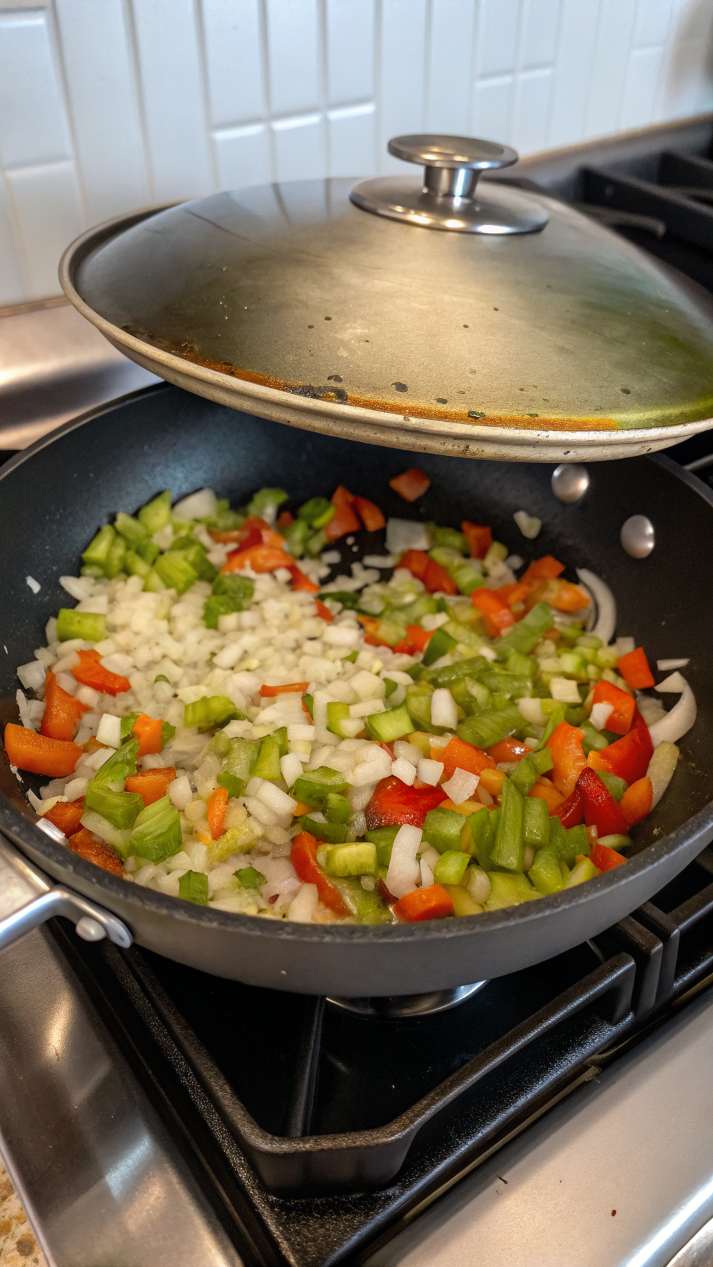 - Add the chopped onion and diced red bell pepper. Cook, stirring occasionally, until softened and lightly browned, about 5–7 minutes.