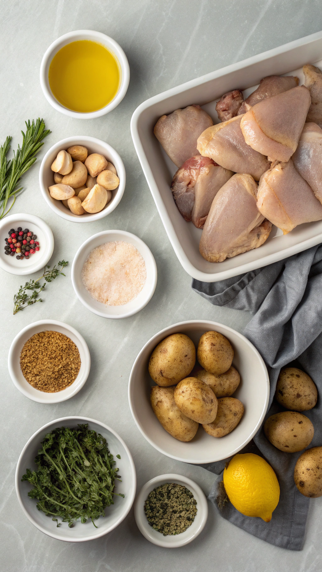- Roast on high heat (about 400–425°F) so the potatoes crisp and the chicken browns.