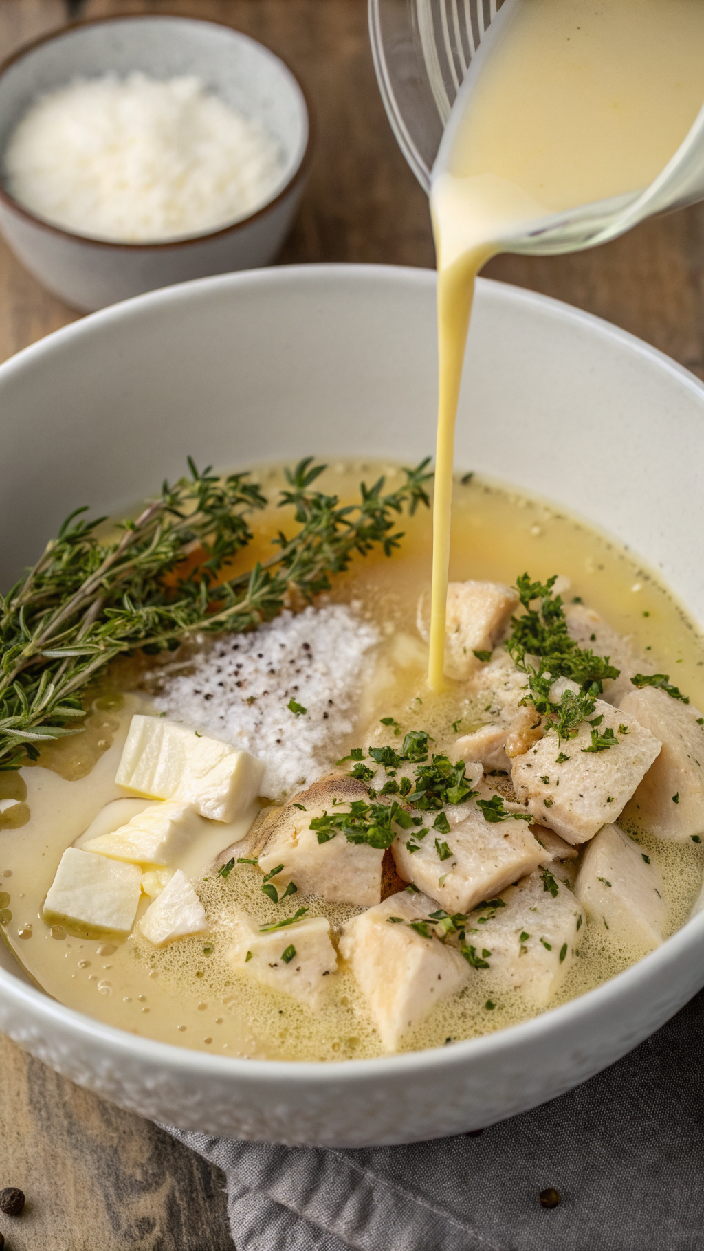 In a large measuring cup or bowl, whisk together the chicken broth, condensed cream of chicken soup, and milk or half and half until smooth. Pour this mixture over the chicken and vegetables. Dot the top with the butter pieces.