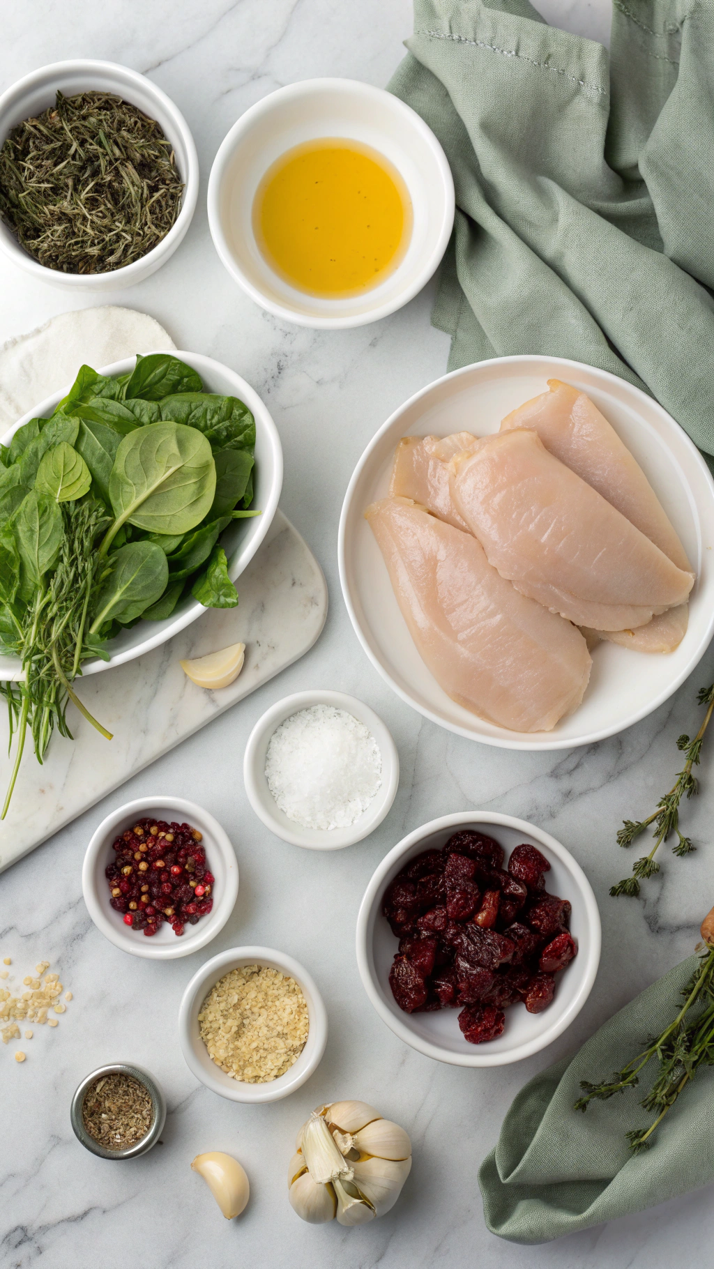 - In a medium bowl, combine the chopped spinach, dried cranberries, feta cheese, minced garlic, dried thyme, remaining salt and pepper, and paprika. Stir until evenly mixed.