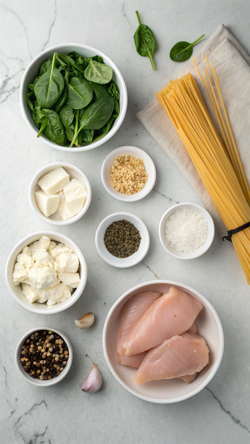 - In a bowl, combine chopped spinach, feta cheese, cream cheese, minced garlic, lemon juice, and lemon zest (if using) until well mixed.