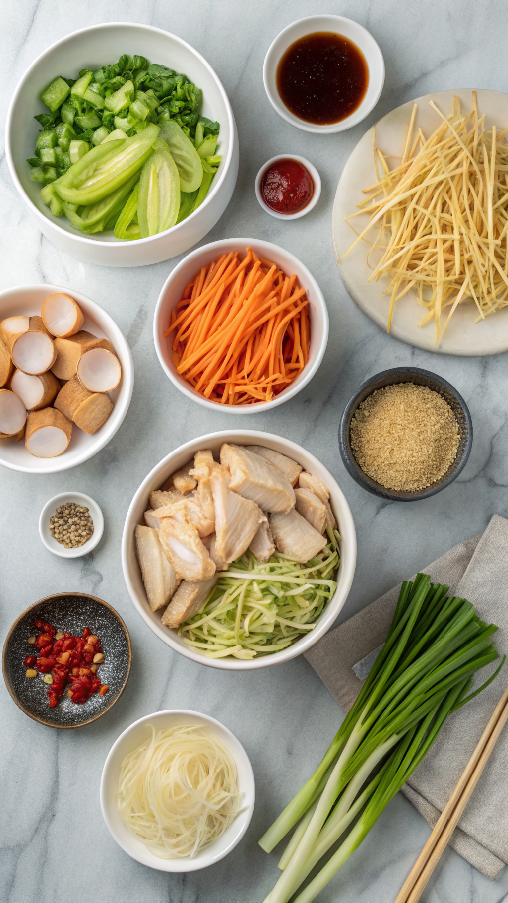 Taste a noodle and a piece of chicken. Adjust with extra soy sauce for salt, honey for sweetness, or chili sauce for heat. Stir in the green parts of the green onions and a sprinkle of sesame seeds.