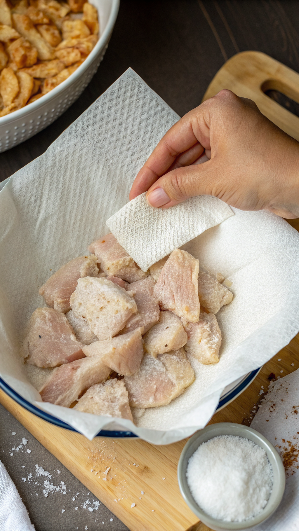 - Pat the chicken dry before coating with cornstarch so it browns instead of steaming.