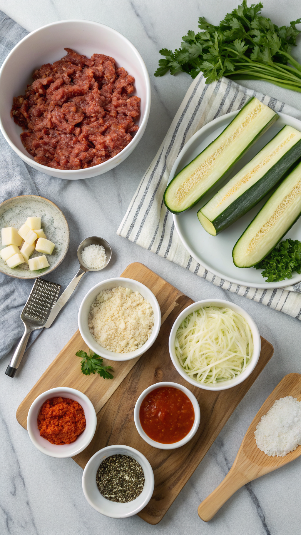 Approximate per serving (1 zucchini boat): 260 calories; fat 14 g; saturated fat 5 g; carbohydrates 15 g; fiber 3 g; sugars 5 g; protein 19 g; sodium 520 mg. Values will vary based on specific ingredients, brands, and portion sizes.
