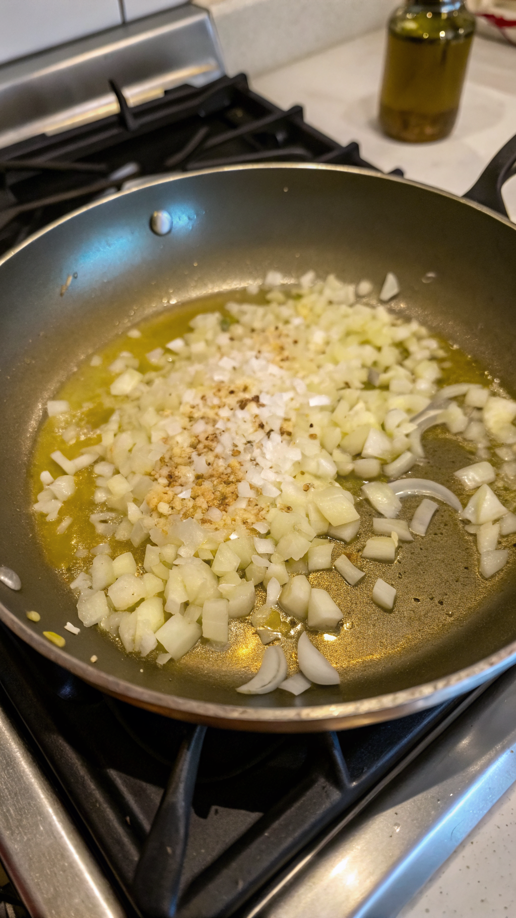- Heat the olive oil in a skillet over medium heat. Add the onion and cook until softened, about 3–4 minutes. Stir in the garlic and cook for 30 seconds until fragrant.