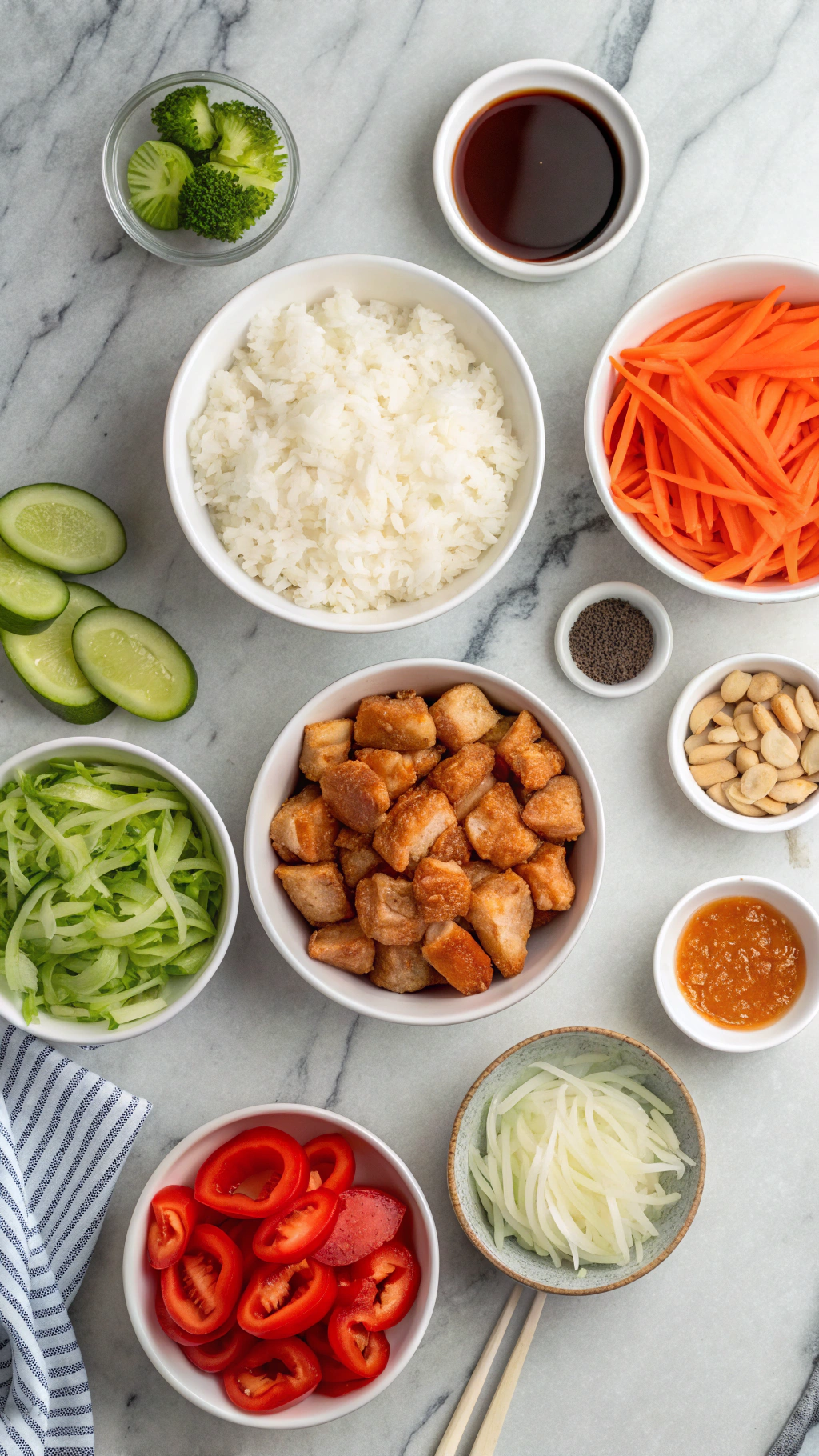 Serve these bowls hot, with the rice warm and fluffy and the chicken still glossy from the sauce. Add crunchy toppings like cucumber, shredded cabbage, or extra carrots to keep every bite interesting. A simple side of steamed edamame or a green salad rounds out the meal without much extra work. Pour sparkling water with lime or iced green tea for a fresh, family-friendly drink pairing.
