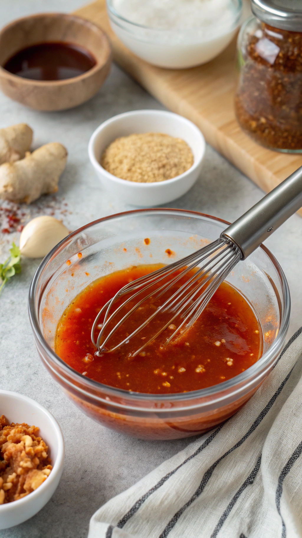 - In a medium bowl, whisk together the sweet chili sauce, soy sauce, rice vinegar, honey, minced garlic, and grated ginger.