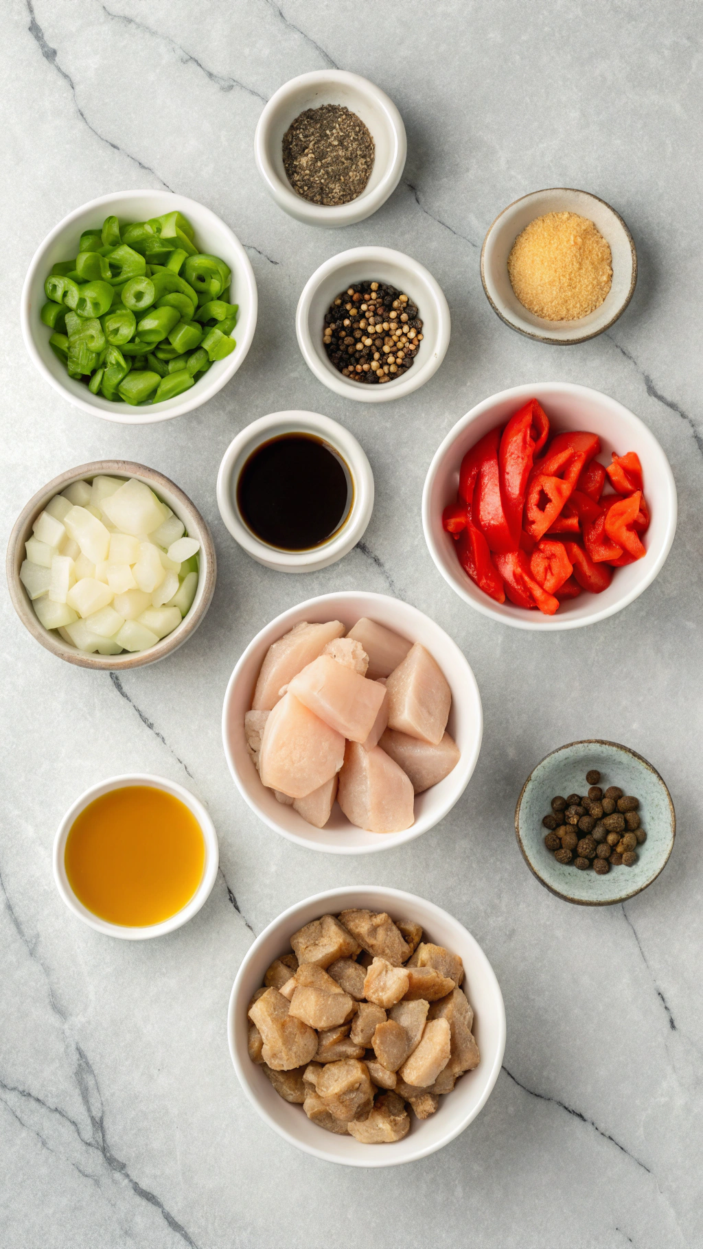 - In a bowl, toss the chicken pieces with 2 tablespoons soy sauce and 1 tablespoon cornstarch until evenly coated. Set aside to marinate for 10 minutes while you prepare the vegetables and sauce.