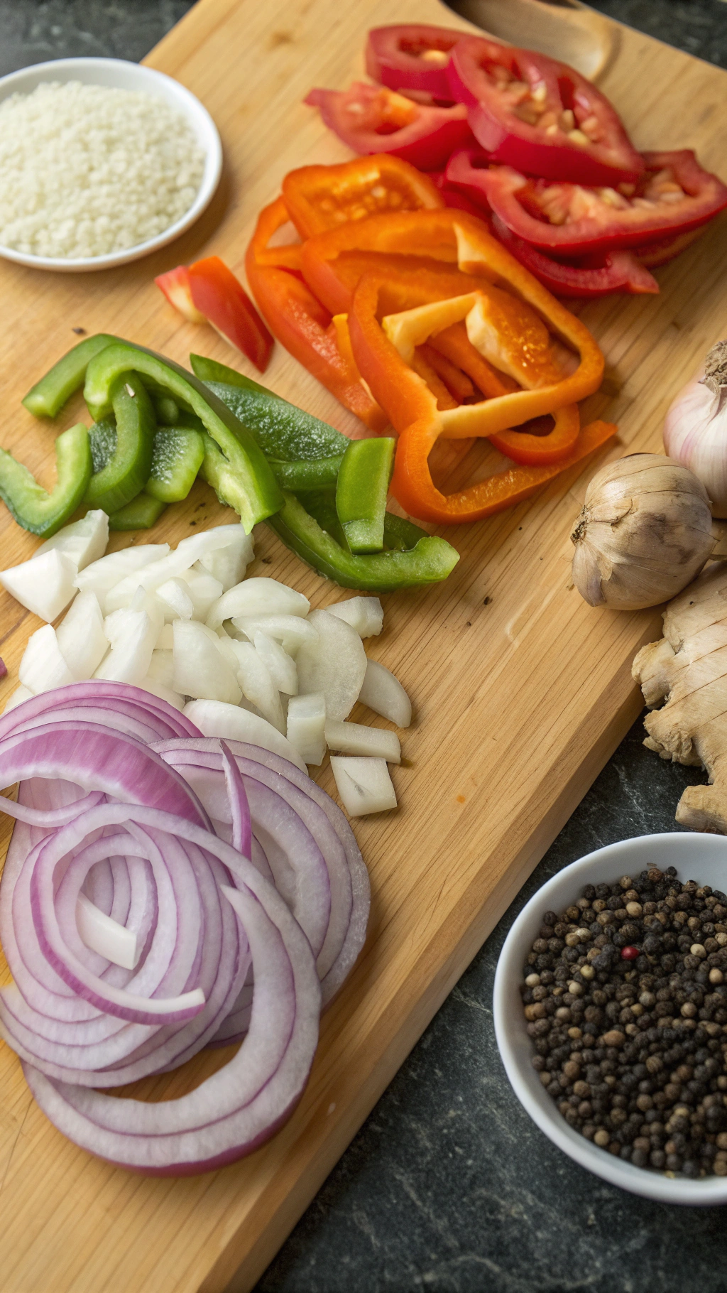 Heat oil in a large skillet or wok over medium high heat. Add onion and cook 2 to 3 minutes until it starts to soften at the edges. Add bell peppers and cook another 2 to 3 minutes so they stay crisp tender. Stir in garlic, ginger, and scallion whites and cook about 1 minute until fragrant, then transfer veggies to a plate.