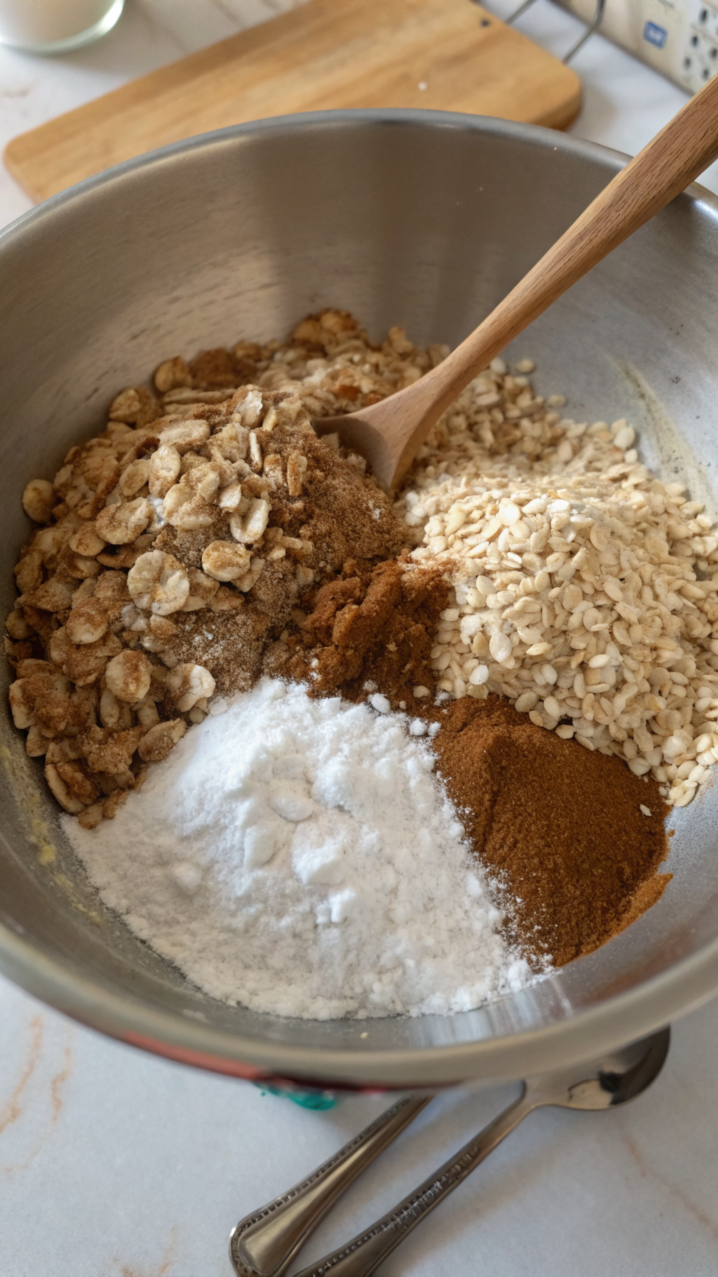 - In a large bowl, combine the rolled oats, brown sugar, baking powder, cinnamon, and salt. Stir until evenly mixed.
