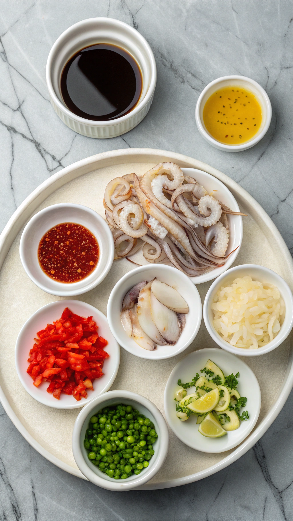 Pour the marinade over the squid and toss well so every piece gets coated. Cover the bowl and chill it for 15 to 30 minutes; stir once halfway so the flavor spreads evenly. Do not marinate longer than 30 minutes, because the lime juice starts to change the texture too much.