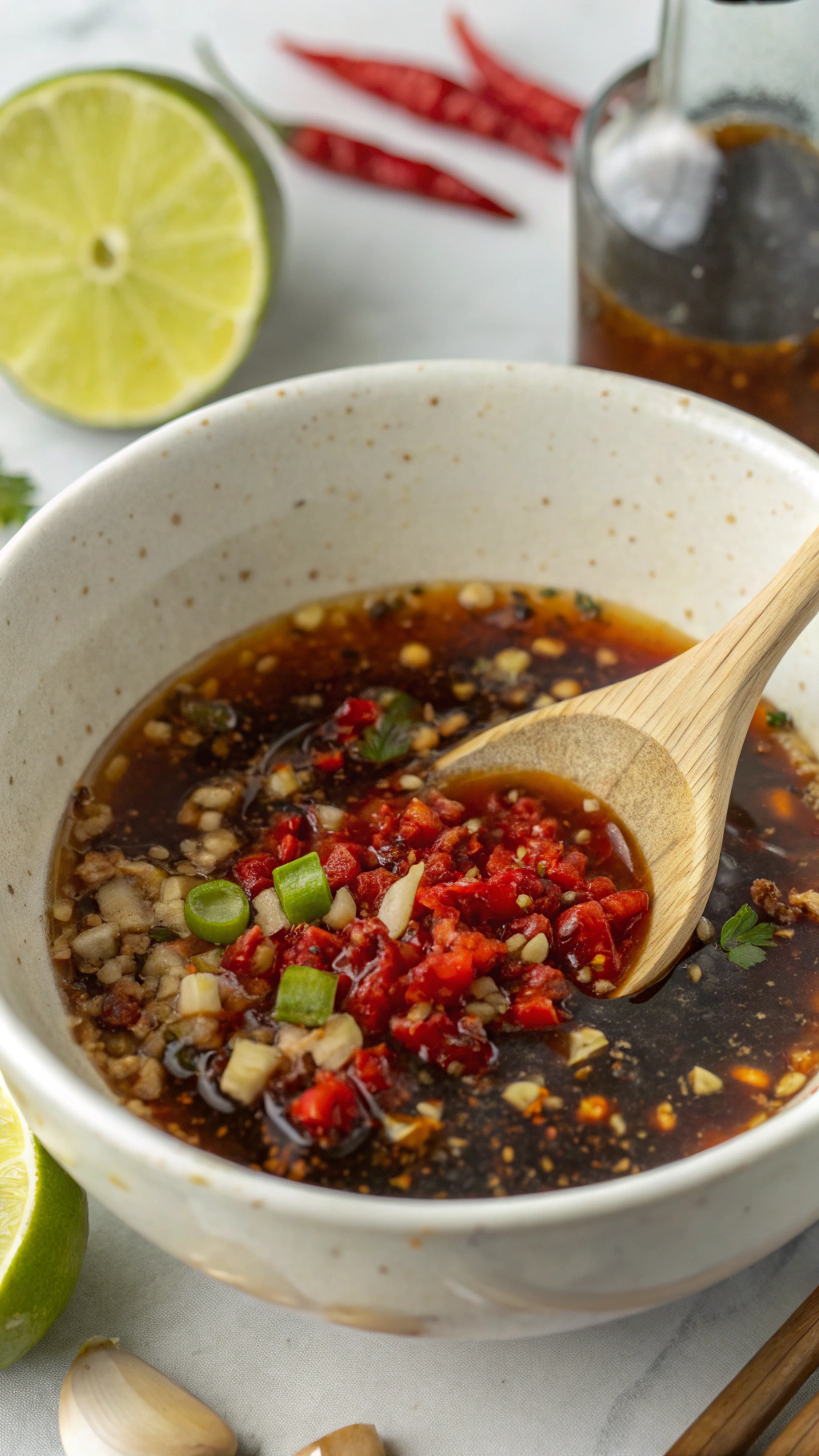 In a small bowl, combine olive oil, sesame oil, soy sauce, fish sauce, lime juice, lime zest, sugar, salt, and black pepper. Add the minced garlic, sliced chili, and optional grated ginger, then stir until the sugar dissolves. Taste the marinade and adjust with more chili for heat or more sugar for balance.