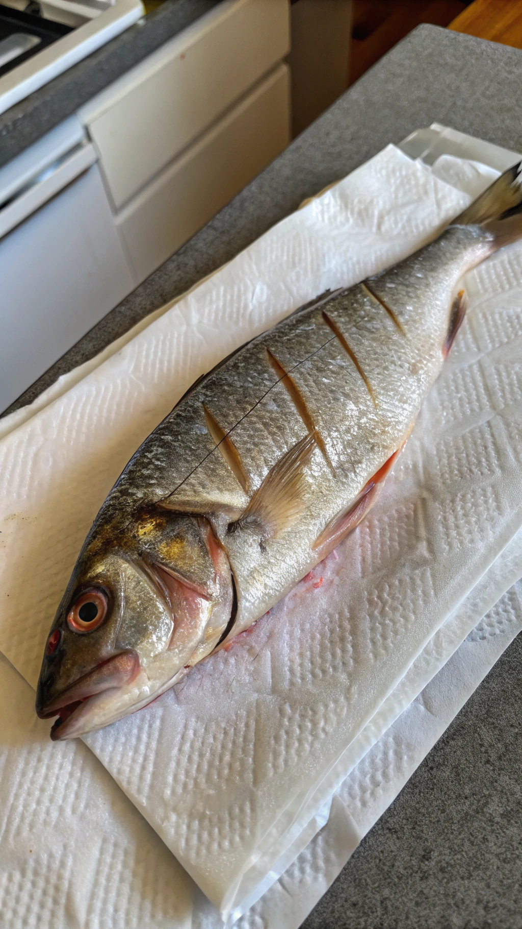 Preheat your oven to 425 degrees Fahrenheit and line a baking sheet with parchment or lightly oiled foil. Rinse the whole fish under cold water, then dry it very well with paper towels, inside and out. Use a sharp knife to score 3 to 4 shallow diagonal cuts on each side of the fish, about 1 inch apart, without cutting to the bone.