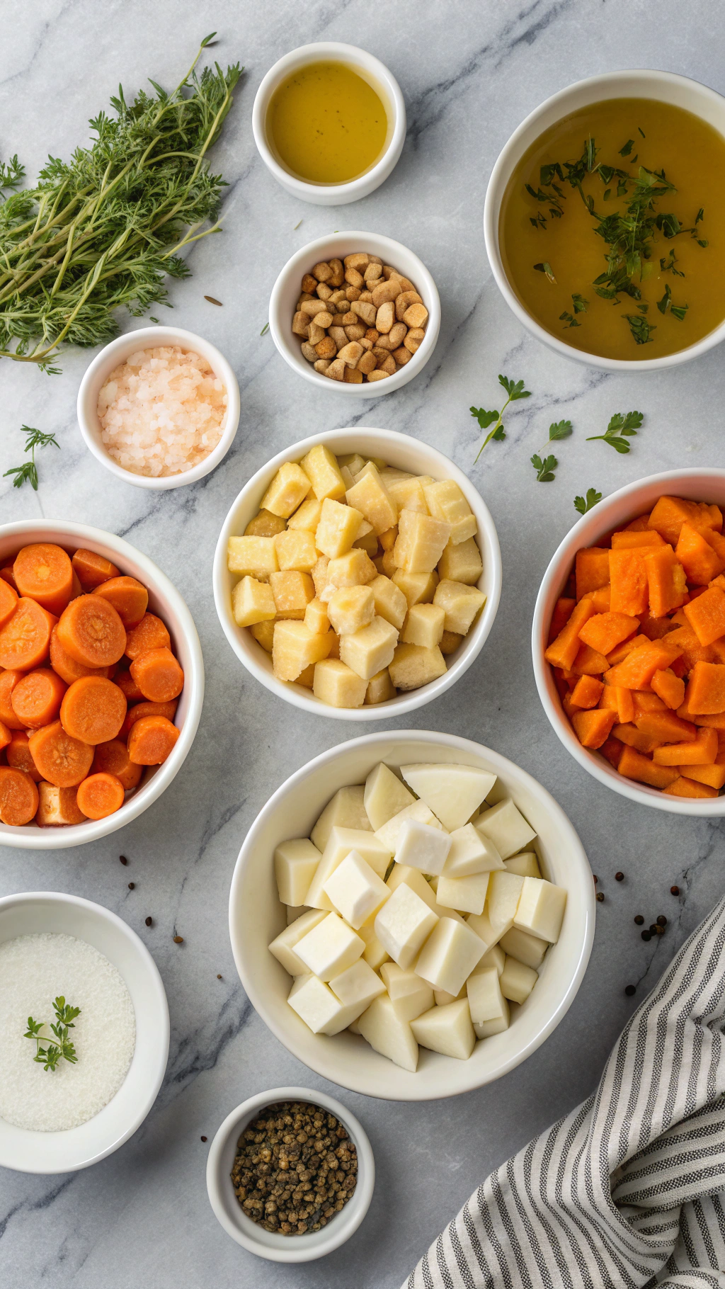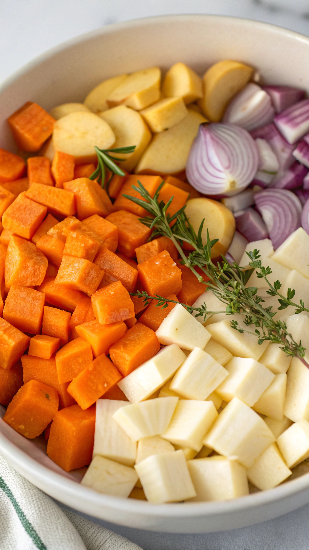 - Place the butternut squash, carrots, parsnips, sweet potato, onion, and garlic on the prepared baking sheet. Drizzle with olive oil, then sprinkle with salt, black pepper, thyme, and rosemary if using. Toss to coat evenly and spread the vegetables in a single layer.