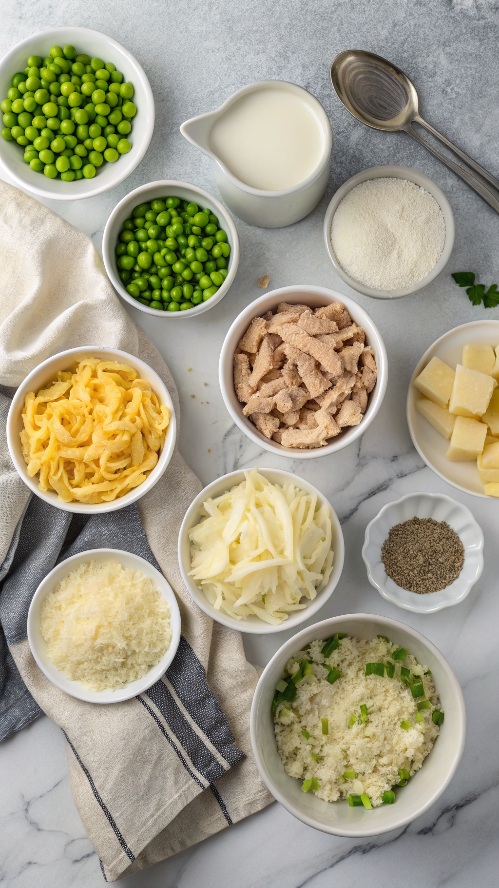 - Stir in the drained tuna, frozen peas, garlic powder, onion powder, salt (if using), black pepper, and shredded cheddar cheese.