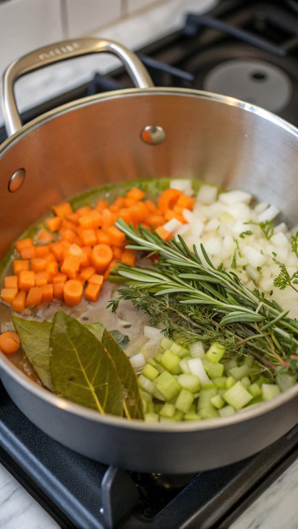 Heat olive oil in a large stock pot or Dutch oven over medium heat. Add onions, carrots, and celery, then cook until they soften and turn slightly golden, about 7 to 8 minutes. Stir in garlic and cook 1 minute, so it smells fragrant but does not brown.